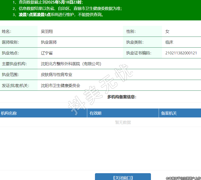 姓名:吳羽翔性別:女醫(yī)師級(jí)別:執(zhí)業(yè)醫(yī)師執(zhí)業(yè)類別:臨床執(zhí)業(yè)地點(diǎn):遼寧省執(zhí)業(yè)證書編碼:210211382000121主要執(zhí)業(yè)機(jī)構(gòu):沈陽(yáng)北方整形外科醫(yī)院(有限公司)執(zhí)業(yè)范圍:皮膚病與性病專業(yè)發(fā)證(批準(zhǔn))機(jī)關(guān):沈陽(yáng)市衛(wèi)生健康委員會(huì) -