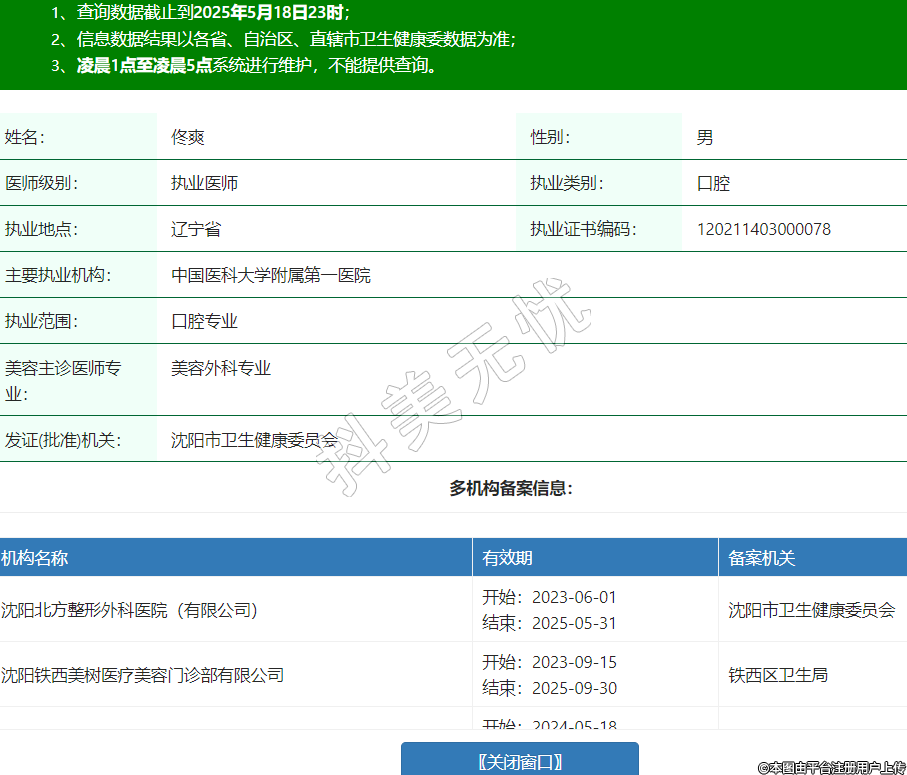 姓名:佟爽性別:男醫(yī)師級(jí)別:執(zhí)業(yè)醫(yī)師執(zhí)業(yè)類別:口腔執(zhí)業(yè)地點(diǎn):遼寧省執(zhí)業(yè)證書(shū)編碼:120211403000078主要執(zhí)業(yè)機(jī)構(gòu):中國(guó)醫(yī)科大學(xué)附屬第一醫(yī)院執(zhí)業(yè)范圍:口腔專業(yè)美容主診醫(yī)師專業(yè):美容外科專業(yè)發(fā)證(批準(zhǔn))機(jī)關(guān):沈陽(yáng)市衛(wèi)生健康委員會(huì)多機(jī)構(gòu)備案信息:機(jī)構(gòu)名稱 有效期 備案機(jī)關(guān) 沈陽(yáng)北方整形外科醫(yī)院(有限公司) 開(kāi)始:2023-06-01結(jié)束:2025-05-31沈陽(yáng)市衛(wèi)生健康委員會(huì) 沈陽(yáng)鐵西美樹(shù)醫(yī)療美容門(mén)診部有限公司 開(kāi)始:2023-09-15結(jié)束:2025-09-30鐵西區(qū)衛(wèi)生局 沈陽(yáng)京沈醫(yī)院 開(kāi)始:2024-05-18結(jié)束:2027-05-17沈陽(yáng)市衛(wèi)生健康委員會(huì) 沈陽(yáng)和平嘉華口腔門(mén)診部有限公司 開(kāi)始:2024-07-17結(jié)束:2026-07-31沈陽(yáng)市和平區(qū)行政審批局 沈陽(yáng)市第四人民醫(yī)院 開(kāi)始:2024-11-11結(jié)束:2026-11-10沈陽(yáng)市衛(wèi)生健康委員會(huì) -