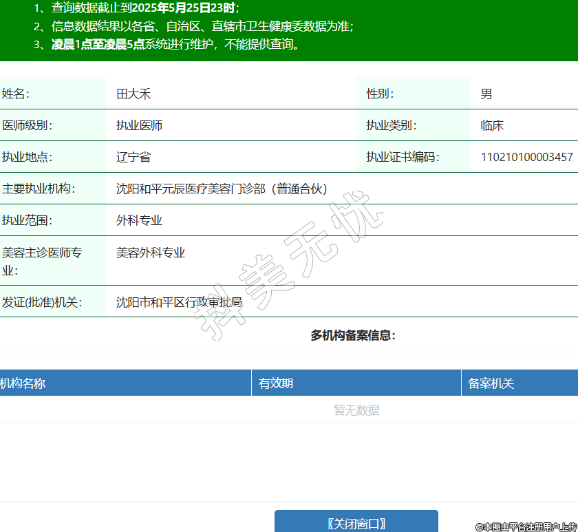 姓名:田大禾性別:男醫(yī)師級別:執(zhí)業(yè)醫(yī)師執(zhí)業(yè)類別:臨床執(zhí)業(yè)地點:遼寧省執(zhí)業(yè)證書編碼:110210100003457主要執(zhí)業(yè)機(jī)構(gòu):沈陽和平元辰醫(yī)療美容門診部(普通合伙)執(zhí)業(yè)范圍:外科專業(yè)美容主診醫(yī)師專業(yè):美容外科專業(yè)發(fā)證(批準(zhǔn))機(jī)關(guān):沈陽市和平區(qū)行政審批局 -