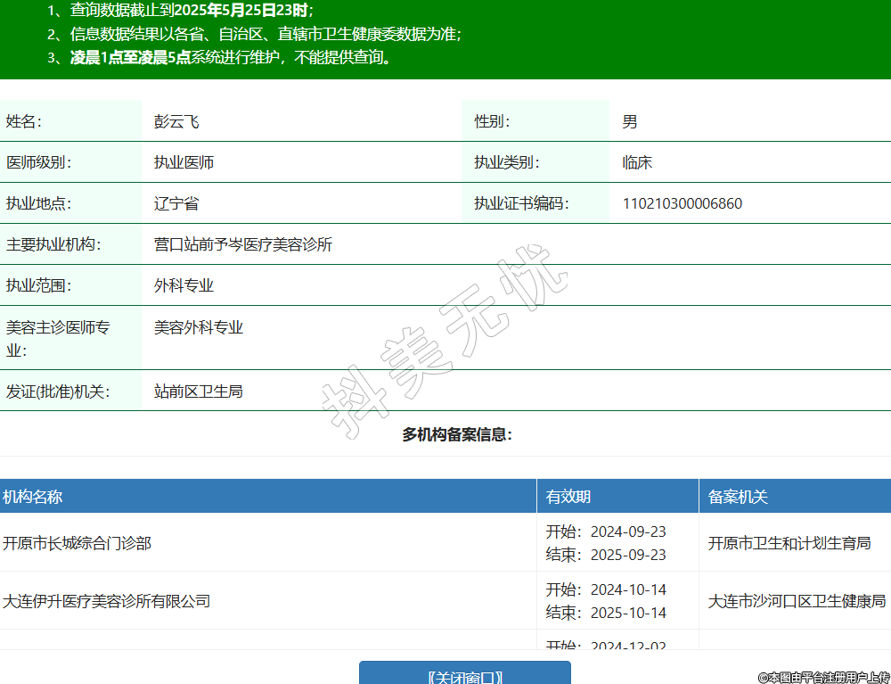 姓名:彭云飛性別:男醫(yī)師級(jí)別:執(zhí)業(yè)醫(yī)師執(zhí)業(yè)類別:臨床執(zhí)業(yè)地點(diǎn):遼寧省執(zhí)業(yè)證書(shū)編碼:110210300006860主要執(zhí)業(yè)機(jī)構(gòu):營(yíng)口站前予岑醫(yī)療美容診所執(zhí)業(yè)范圍:外科專業(yè)美容主診醫(yī)師專業(yè):美容外科專業(yè)發(fā)證(批準(zhǔn))機(jī)關(guān):站前區(qū)衛(wèi)生局多機(jī)構(gòu)備案信息:機(jī)構(gòu)名稱 有效期 備案機(jī)關(guān) 開(kāi)原市長(zhǎng)城綜合門(mén)診部 開(kāi)始:2024-09-23結(jié)束:2025-09-23開(kāi)原市衛(wèi)生和計(jì)劃生育局 大連伊升醫(yī)療美容診所有限公司 開(kāi)始:2024-10-14結(jié)束:2025-10-14大連市沙河口區(qū)衛(wèi)生健康局 大連銳斯醫(yī)療美容診所有限公司 開(kāi)始:2024-12-02結(jié)束:2025-12-01大連市沙河口區(qū)衛(wèi)生健康局 大連初禾醫(yī)美綜合門(mén)診部有限公司 開(kāi)始:2025-03-24結(jié)束:2028-03-31莊河市衛(wèi)生健康局 沈陽(yáng)澳紫汣美醫(yī)療管理有限公司渾南臨波路醫(yī)療美容診所(分公司) 開(kāi)始:2025-04-21結(jié)束:2028-04-29沈陽(yáng)市渾南區(qū)衛(wèi)生健康局 -