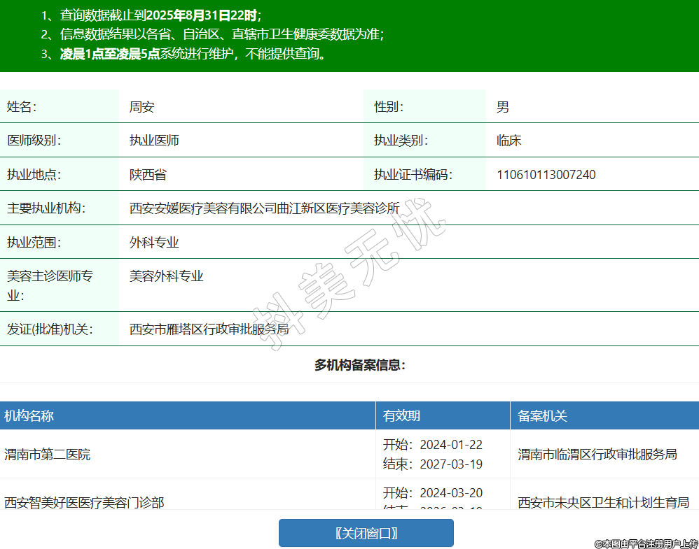 姓名:周安性別:男醫(yī)師級別:執(zhí)業(yè)醫(yī)師執(zhí)業(yè)類別:臨床執(zhí)業(yè)地點:陜西省執(zhí)業(yè)證書編碼:110610113007240主要執(zhí)業(yè)機構(gòu):西安安媛醫(yī)療美容有限公司曲江新區(qū)醫(yī)療美容診所執(zhí)業(yè)范圍:外科專業(yè)美容主診醫(yī)師專業(yè):美容外科專業(yè)發(fā)證(批準(zhǔn))機關(guān):西安市雁塔區(qū)行政審批服務(wù)局多機構(gòu)備案信息:機構(gòu)名稱 有效期 備案機關(guān) 渭南市第二醫(yī)院 開始:2024-01-22結(jié)束:2027-03-19渭南市臨渭區(qū)行政審批服務(wù)局 西安智美好醫(yī)醫(yī)療美容門診部 開始:2024-03-20結(jié)束:2026-03-19西安市未央?yún)^(qū)衛(wèi)生和計劃生育局 西安星容妍醫(yī)療科技有限責(zé)任公司曲江新區(qū)醫(yī)療美容診所 開始:2024-11-21結(jié)束:2025-11-20西安市雁塔區(qū)行政審批服務(wù)局 -