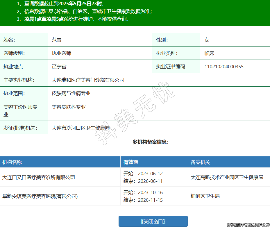 姓名:范雪性別:女醫(yī)師級(jí)別:執(zhí)業(yè)醫(yī)師執(zhí)業(yè)類(lèi)別:臨床執(zhí)業(yè)地點(diǎn):遼寧省執(zhí)業(yè)證書(shū)編碼:110210204000355主要執(zhí)業(yè)機(jī)構(gòu):大連瑞和醫(yī)療美容門(mén)診部有限公司執(zhí)業(yè)范圍:皮膚病與性病專(zhuān)業(yè)美容主診醫(yī)師專(zhuān)業(yè):美容皮膚科專(zhuān)業(yè)發(fā)證(批準(zhǔn))機(jī)關(guān):大連市沙河口區(qū)衛(wèi)生健康局多機(jī)構(gòu)備案信息:機(jī)構(gòu)名稱(chēng) 有效期 備案機(jī)關(guān) 大連白又白醫(yī)療美容診所有限公司 開(kāi)始:2023-06-12結(jié)束:2026-06-11大連高新技術(shù)產(chǎn)業(yè)園區(qū)衛(wèi)生健康局 阜新安琪美醫(yī)療美容醫(yī)院(有限公司) 開(kāi)始:2023-10-16結(jié)束:2026-11-15細(xì)河區(qū)衛(wèi)生局 -