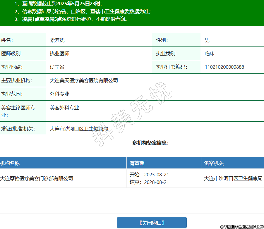 姓名:梁濱沈性別:男醫(yī)師級(jí)別:執(zhí)業(yè)醫(yī)師執(zhí)業(yè)類別:臨床執(zhí)業(yè)地點(diǎn):遼寧省執(zhí)業(yè)證書編碼:110210200000888主要執(zhí)業(yè)機(jī)構(gòu):大連美天醫(yī)療美容醫(yī)院有限公司執(zhí)業(yè)范圍:外科專業(yè)美容主診醫(yī)師專業(yè):美容外科專業(yè)發(fā)證(批準(zhǔn))機(jī)關(guān):大連市沙河口區(qū)衛(wèi)生健康局多機(jī)構(gòu)備案信息:機(jī)構(gòu)名稱 有效期 備案機(jī)關(guān) 大連摩格醫(yī)療美容門診部有限公司 開(kāi)始:2023-08-21結(jié)束:2028-08-21大連市沙河口區(qū)衛(wèi)生健康局 -