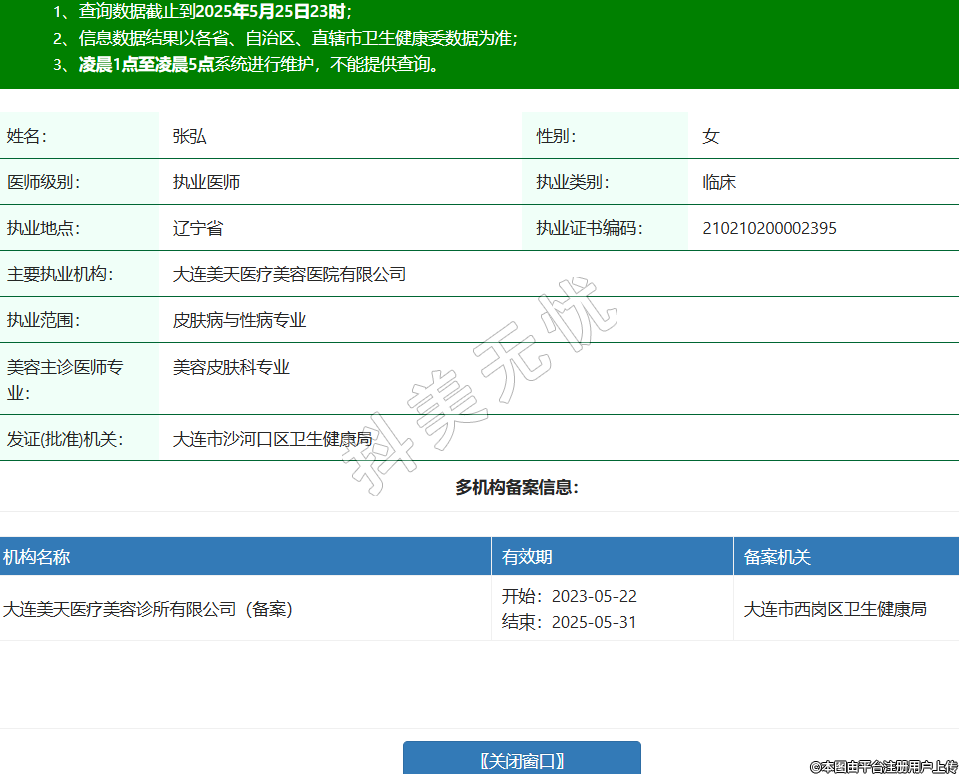 姓名:張弘性別:女醫(yī)師級別:執(zhí)業(yè)醫(yī)師執(zhí)業(yè)類別:臨床執(zhí)業(yè)地點:遼寧省執(zhí)業(yè)證書編碼:210210200002395主要執(zhí)業(yè)機(jī)構(gòu):大連美天醫(yī)療美容醫(yī)院有限公司執(zhí)業(yè)范圍:皮膚病與性病專業(yè)美容主診醫(yī)師專業(yè):美容皮膚科專業(yè)發(fā)證(批準(zhǔn))機(jī)關(guān):大連市沙河口區(qū)衛(wèi)生健康局多機(jī)構(gòu)備案信息:機(jī)構(gòu)名稱 有效期 備案機(jī)關(guān) 大連美天醫(yī)療美容診所有限公司(備案) 開始:2023-05-22結(jié)束:2025-05-31大連市西崗區(qū)衛(wèi)生健康局 -
