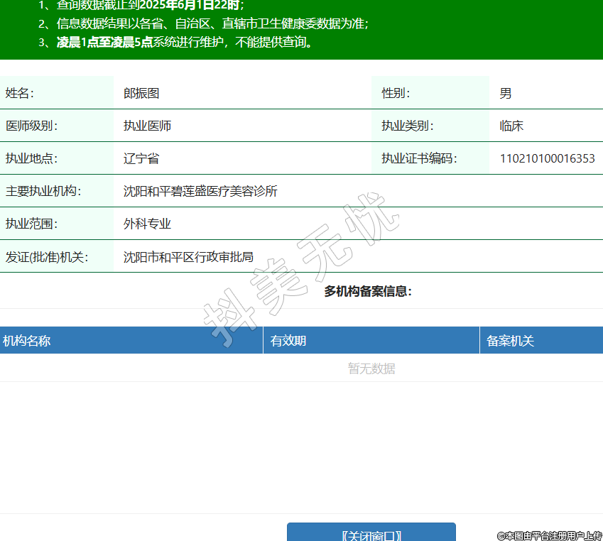 姓名:郎振圖性別:男醫(yī)師級別:執(zhí)業(yè)醫(yī)師執(zhí)業(yè)類別:臨床執(zhí)業(yè)地點:遼寧省執(zhí)業(yè)證書編碼:110210100016353主要執(zhí)業(yè)機構:沈陽和平碧蓮盛醫(yī)療美容診所執(zhí)業(yè)范圍:外科專業(yè)發(fā)證(批準)機關:沈陽市和平區(qū)行政審批局 -
