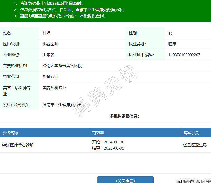 姓名:杜娟性別:女醫(yī)師級(jí)別:執(zhí)業(yè)醫(yī)師執(zhí)業(yè)類別:臨床執(zhí)業(yè)地點(diǎn):山東省執(zhí)業(yè)證書編碼:110370102002207主要執(zhí)業(yè)機(jī)構(gòu):濟(jì)南藝星整形美容醫(yī)院執(zhí)業(yè)范圍:外科專業(yè)美容主診醫(yī)師專業(yè):美容外科專業(yè)發(fā)證(批準(zhǔn))機(jī)關(guān):濟(jì)南市衛(wèi)生健康委員會(huì)多機(jī)構(gòu)備案信息:機(jī)構(gòu)名稱 有效期 備案機(jī)關(guān) 韓漾醫(yī)療美容診所 開始:2024-06-06結(jié)束:2025-06-05岱岳區(qū)衛(wèi)生局 -