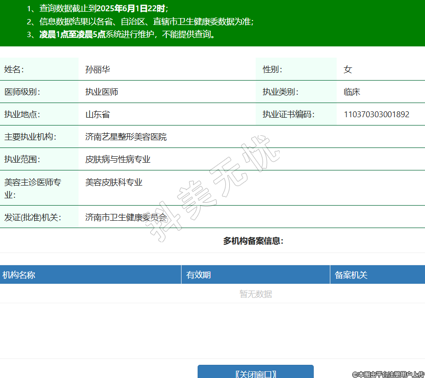 姓名:孫麗華性別:女醫(yī)師級別:執(zhí)業(yè)醫(yī)師執(zhí)業(yè)類別:臨床執(zhí)業(yè)地點:山東省執(zhí)業(yè)證書編碼:110370303001892主要執(zhí)業(yè)機構:濟南藝星整形美容醫(yī)院執(zhí)業(yè)范圍:皮膚病與性病專業(yè)美容主診醫(yī)師專業(yè):美容皮膚科專業(yè)發(fā)證(批準)機關:濟南市衛(wèi)生健康委員會 -