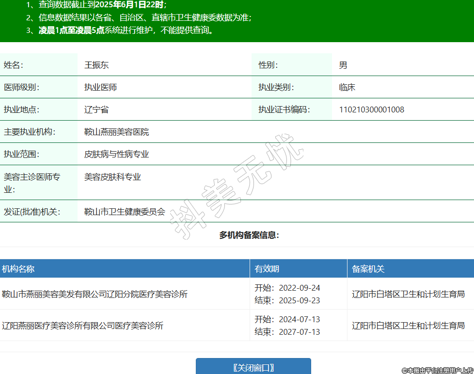 姓名:王振東性別:男醫(yī)師級別:執(zhí)業(yè)醫(yī)師執(zhí)業(yè)類別:臨床執(zhí)業(yè)地點:遼寧省執(zhí)業(yè)證書編碼:110210300001008主要執(zhí)業(yè)機構(gòu):鞍山燕麗美容醫(yī)院執(zhí)業(yè)范圍:皮膚病與性病專業(yè)美容主診醫(yī)師專業(yè):美容皮膚科專業(yè)發(fā)證(批準(zhǔn))機關(guān):鞍山市衛(wèi)生健康委員會多機構(gòu)備案信息:機構(gòu)名稱 有效期 備案機關(guān) 鞍山市燕麗美容美發(fā)有限公司遼陽分院醫(yī)療美容診所 開始:2022-09-24結(jié)束:2025-09-23遼陽市白塔區(qū)衛(wèi)生和計劃生育局 遼陽燕麗醫(yī)療美容診所有限公司醫(yī)療美容診所 開始:2024-07-13結(jié)束:2027-07-13遼陽市白塔區(qū)衛(wèi)生和計劃生育局 -