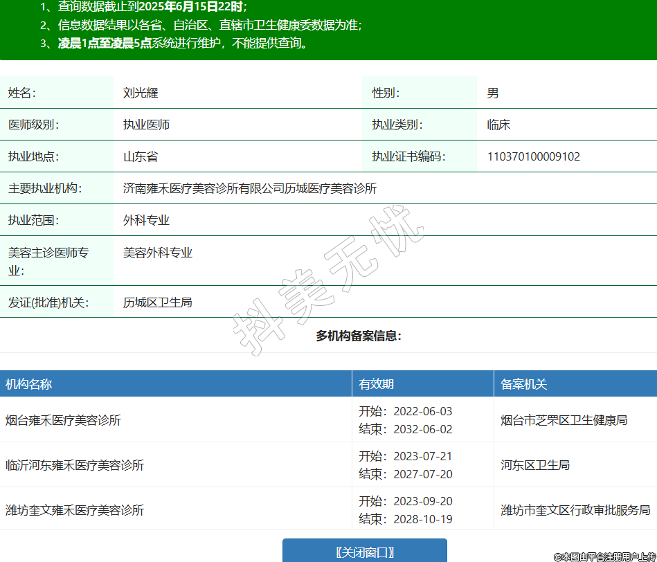 姓名:劉光耀性別:男醫(yī)師級別:執(zhí)業(yè)醫(yī)師執(zhí)業(yè)類別:臨床執(zhí)業(yè)地點:山東省執(zhí)業(yè)證書編碼:110370100009102主要執(zhí)業(yè)機(jī)構(gòu):濟(jì)南雍禾醫(yī)療美容診所有限公司歷城醫(yī)療美容診所執(zhí)業(yè)范圍:外科專業(yè)美容主診醫(yī)師專業(yè):美容外科專業(yè)發(fā)證(批準(zhǔn))機(jī)關(guān):歷城區(qū)衛(wèi)生局多機(jī)構(gòu)備案信息:機(jī)構(gòu)名稱 有效期 備案機(jī)關(guān) 煙臺雍禾醫(yī)療美容診所 開始:2022-06-03結(jié)束:2032-06-02煙臺市芝罘區(qū)衛(wèi)生健康局 臨沂河?xùn)|雍禾醫(yī)療美容診所 開始:2023-07-21結(jié)束:2027-07-20河?xùn)|區(qū)衛(wèi)生局 濰坊奎文雍禾醫(yī)療美容診所 開始:2023-09-20結(jié)束:2028-10-19濰坊市奎文區(qū)行政審批服務(wù)局 東營雍禾醫(yī)療美容有限公司雍禾醫(yī)療美容診所 開始:2023-10-17結(jié)束:2026-10-16東營經(jīng)濟(jì)技術(shù)開發(fā)區(qū)審批服務(wù)部 青島雍禾既美醫(yī)療美容有限公司市南醫(yī)療美容診所 開始:2025-04-06結(jié)束:2030-05-06青島市市南區(qū)行政審批服務(wù)局 -