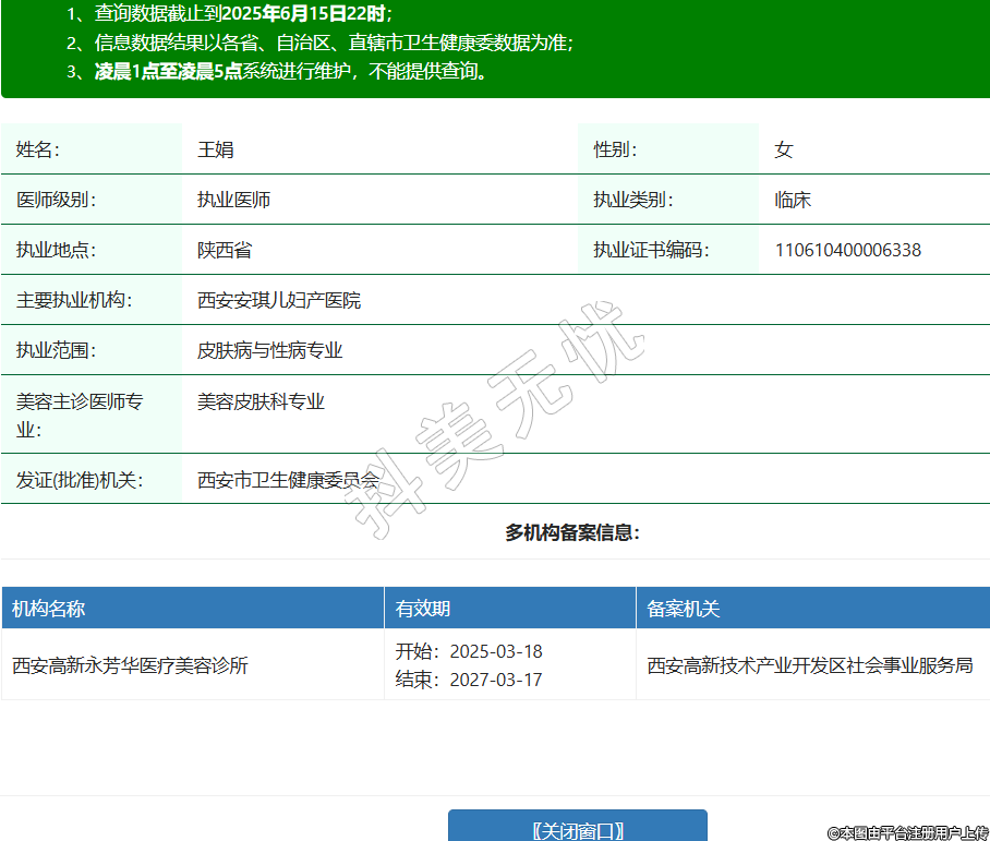 姓名:王娟性別:女醫(yī)師級別:執(zhí)業(yè)醫(yī)師執(zhí)業(yè)類別:臨床執(zhí)業(yè)地點:陜西省執(zhí)業(yè)證書編碼:110610400006338主要執(zhí)業(yè)機構:西安安琪兒婦產(chǎn)醫(yī)院執(zhí)業(yè)范圍:皮膚病與性病專業(yè)美容主診醫(yī)師專業(yè):美容皮膚科專業(yè)發(fā)證(批準)機關:西安市衛(wèi)生健康委員會多機構備案信息:機構名稱 有效期 備案機關 西安高新永芳華醫(yī)療美容診所 開始:2025-03-18結束:2027-03-17西安高新技術產(chǎn)業(yè)開發(fā)區(qū)社會事業(yè)服務局 -
