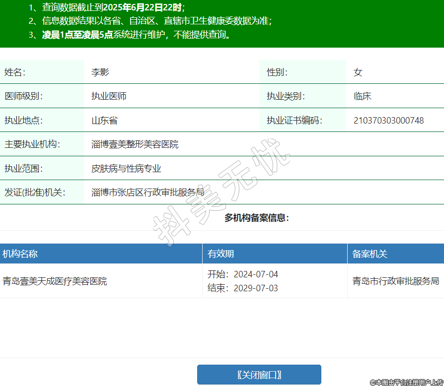 姓名:李影性別:女醫(yī)師級別:執(zhí)業(yè)醫(yī)師執(zhí)業(yè)類別:臨床執(zhí)業(yè)地點:山東省執(zhí)業(yè)證書編碼:210370303000748主要執(zhí)業(yè)機構:淄博壹美整形美容醫(yī)院執(zhí)業(yè)范圍:皮膚病與性病專業(yè)發(fā)證(批準)機關:淄博市張店區(qū)行政審批服務局多機構備案信息:機構名稱 有效期 備案機關 青島壹美天成醫(yī)療美容醫(yī)院 開始:2024-07-04結束:2029-07-03青島市行政審批服務局 -