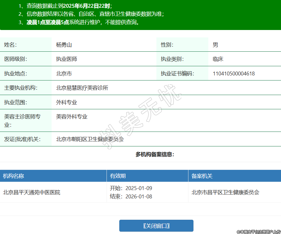 姓名:楊勇山性別:男醫(yī)師級別:執(zhí)業(yè)醫(yī)師執(zhí)業(yè)類別:臨床執(zhí)業(yè)地點:北京市執(zhí)業(yè)證書編碼:110410500004618主要執(zhí)業(yè)機構(gòu):北京易慧醫(yī)療美容診所執(zhí)業(yè)范圍:外科專業(yè)美容主診醫(yī)師專業(yè):美容外科專業(yè)發(fā)證(批準)機關(guān):北京市朝陽區(qū)衛(wèi)生健康委員會多機構(gòu)備案信息:機構(gòu)名稱 有效期 備案機關(guān) 北京昌平天通苑中醫(yī)醫(yī)院 開始:2025-01-09結(jié)束:2026-01-08北京市昌平區(qū)衛(wèi)生健康委員會 -