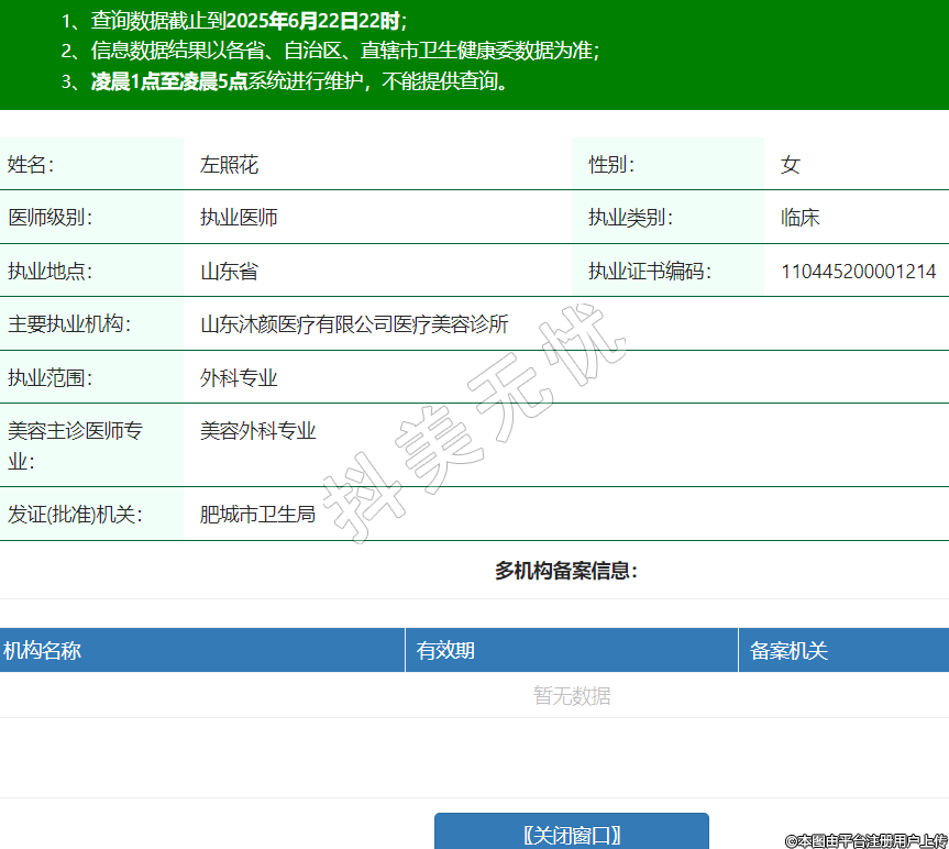 姓名:左照花性別:女醫(yī)師級(jí)別:執(zhí)業(yè)醫(yī)師執(zhí)業(yè)類(lèi)別:臨床執(zhí)業(yè)地點(diǎn):山東省執(zhí)業(yè)證書(shū)編碼:110445200001214主要執(zhí)業(yè)機(jī)構(gòu):山東沐顏醫(yī)療有限公司醫(yī)療美容診所執(zhí)業(yè)范圍:外科專(zhuān)業(yè)美容主診醫(yī)師專(zhuān)業(yè):美容外科專(zhuān)業(yè)發(fā)證(批準(zhǔn))機(jī)關(guān):肥城市衛(wèi)生局 -