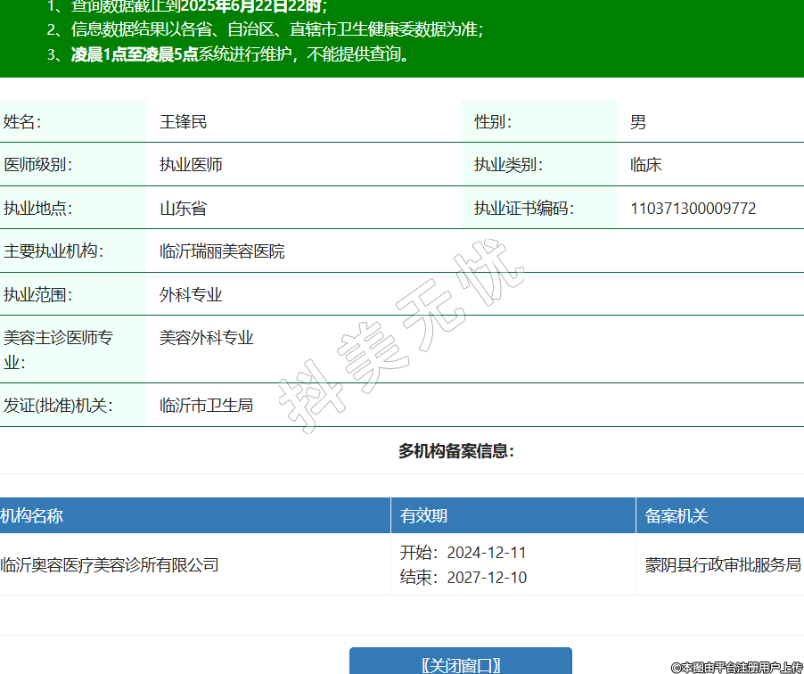 姓名:王鋒民性別:男醫(yī)師級(jí)別:執(zhí)業(yè)醫(yī)師執(zhí)業(yè)類別:臨床執(zhí)業(yè)地點(diǎn):山東省執(zhí)業(yè)證書(shū)編碼:110371300009772主要執(zhí)業(yè)機(jī)構(gòu):臨沂瑞麗美容醫(yī)院執(zhí)業(yè)范圍:外科專業(yè)美容主診醫(yī)師專業(yè):美容外科專業(yè)發(fā)證(批準(zhǔn))機(jī)關(guān):臨沂市衛(wèi)生局多機(jī)構(gòu)備案信息:機(jī)構(gòu)名稱 有效期 備案機(jī)關(guān) 臨沂奧容醫(yī)療美容診所有限公司 開(kāi)始:2024-12-11結(jié)束:2027-12-10蒙陰縣行政審批服務(wù)局 -