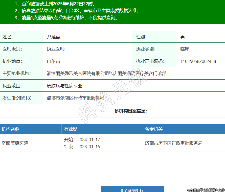 姓名:尹延喜性別:男醫(yī)師級別:執(zhí)業(yè)醫(yī)師執(zhí)業(yè)類別:臨床執(zhí)業(yè)地點:山東省執(zhí)業(yè)證書編碼:110350582002458主要執(zhí)業(yè)機構(gòu):淄博麗美整形美容醫(yī)院有限公司張店麗美涵玥醫(yī)療美容門診部執(zhí)業(yè)范圍:皮膚病與性病專業(yè)發(fā)證(批準(zhǔn))機關(guān):淄博市張店區(qū)行政審批服務(wù)局多機構(gòu)備案信息:機構(gòu)名稱 有效期 備案機關(guān) 濟南美康醫(yī)院 開始:2024-01-17結(jié)束:2028-01-16濟南市歷下區(qū)行政審批服務(wù)局 -