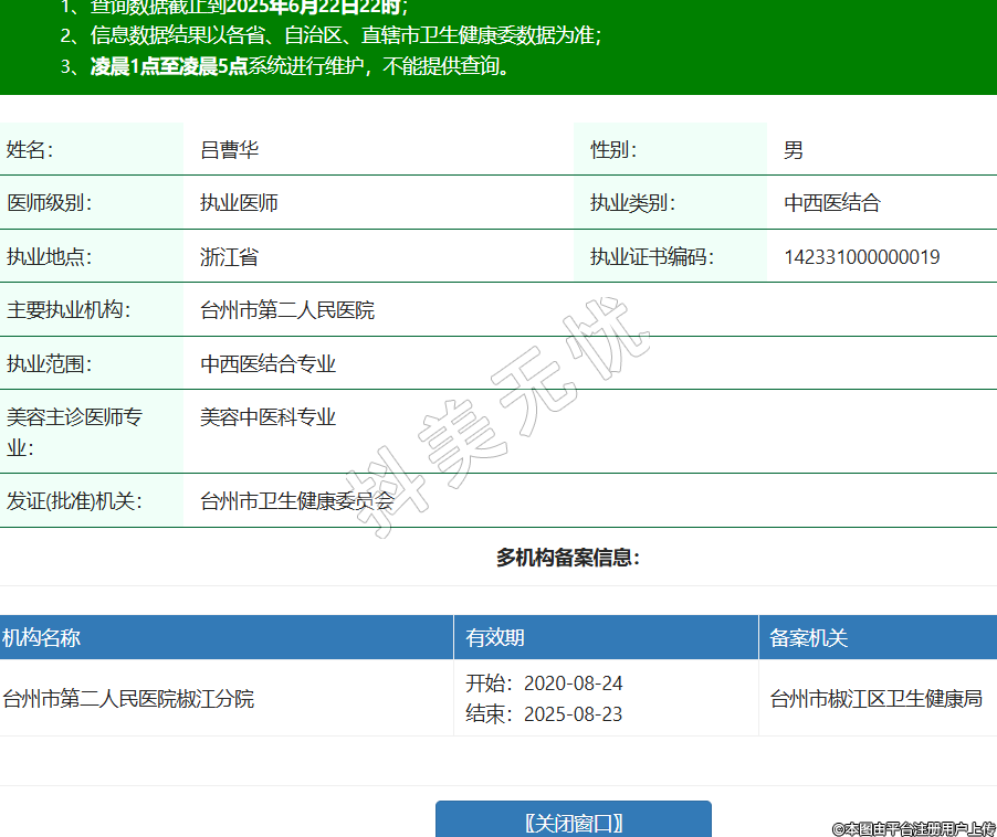 姓名:呂曹華性別:男醫(yī)師級別:執(zhí)業(yè)醫(yī)師執(zhí)業(yè)類別:中西醫(yī)結(jié)合執(zhí)業(yè)地點:浙江省執(zhí)業(yè)證書編碼:142331000000019主要執(zhí)業(yè)機構(gòu):臺州市第二人民醫(yī)院執(zhí)業(yè)范圍:中西醫(yī)結(jié)合專業(yè)美容主診醫(yī)師專業(yè):美容中醫(yī)科專業(yè)發(fā)證(批準)機關(guān):臺州市衛(wèi)生健康委員會多機構(gòu)備案信息:機構(gòu)名稱 有效期 備案機關(guān) 臺州市第二人民醫(yī)院椒江分院 開始:2020-08-24結(jié)束:2025-08-23臺州市椒江區(qū)衛(wèi)生健康局 -