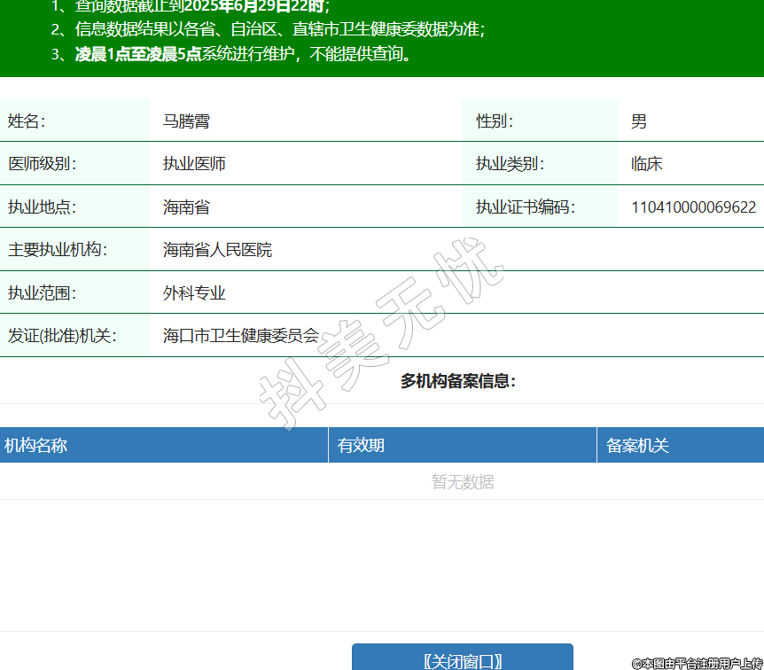 姓名:馬騰霄性別:男醫(yī)師級別:執(zhí)業(yè)醫(yī)師執(zhí)業(yè)類別:臨床執(zhí)業(yè)地點:海南省執(zhí)業(yè)證書編碼:110410000069622主要執(zhí)業(yè)機(jī)構(gòu):海南省人民醫(yī)院執(zhí)業(yè)范圍:外科專業(yè)發(fā)證(批準(zhǔn))機(jī)關(guān):??谑行l(wèi)生健康委員會 -