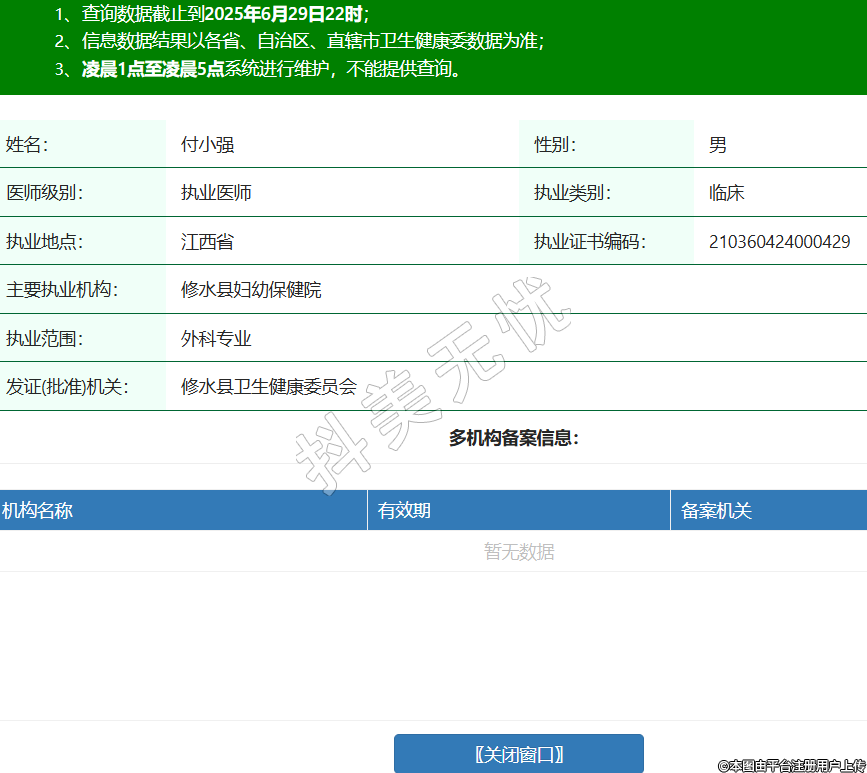 姓名:付小強性別:男醫(yī)師級別:執(zhí)業(yè)醫(yī)師執(zhí)業(yè)類別:臨床執(zhí)業(yè)地點:江西省執(zhí)業(yè)證書編碼:210360424000429主要執(zhí)業(yè)機構(gòu):修水縣婦幼保健院執(zhí)業(yè)范圍:外科專業(yè)發(fā)證(批準)機關:修水縣衛(wèi)生健康委員會 -
