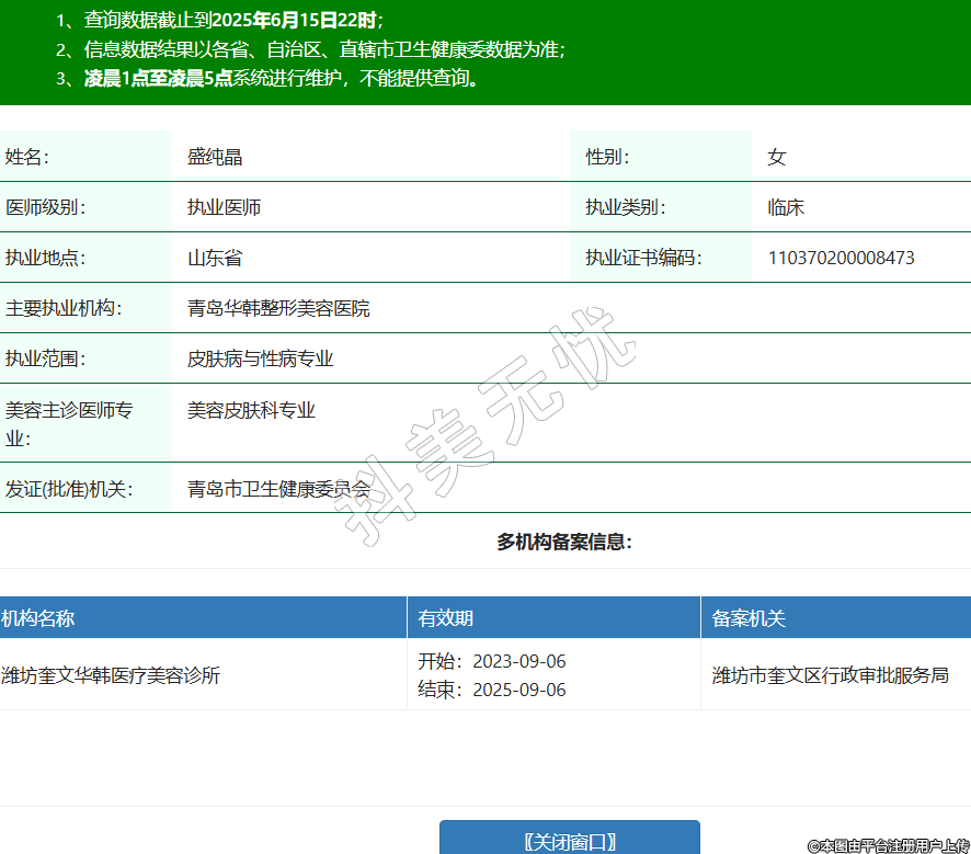姓名:盛純晶性別:女醫(yī)師級別:執(zhí)業(yè)醫(yī)師執(zhí)業(yè)類別:臨床執(zhí)業(yè)地點(diǎn):山東省執(zhí)業(yè)證書編碼:110370200008473主要執(zhí)業(yè)機(jī)構(gòu):青島華韓整形美容醫(yī)院執(zhí)業(yè)范圍:皮膚病與性病專業(yè)美容主診醫(yī)師專業(yè):美容皮膚科專業(yè)發(fā)證(批準(zhǔn))機(jī)關(guān):青島市衛(wèi)生健康委員會多機(jī)構(gòu)備案信息:機(jī)構(gòu)名稱 有效期 備案機(jī)關(guān) 濰坊奎文華韓醫(yī)療美容診所 開始:2023-09-06結(jié)束:2025-09-06濰坊市奎文區(qū)行政審批服務(wù)局 -
