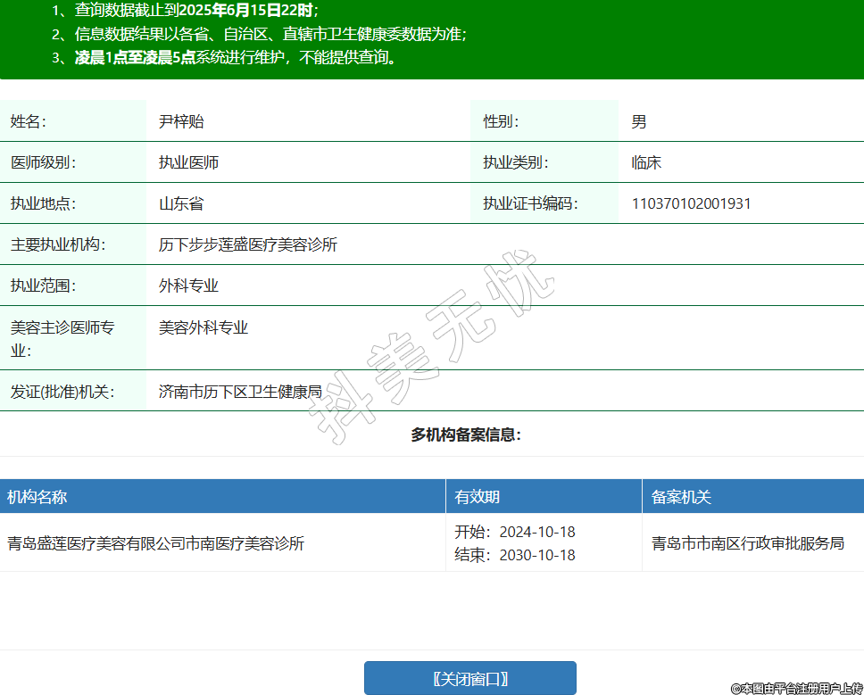 姓名:尹梓貽性別:男醫(yī)師級別:執(zhí)業(yè)醫(yī)師執(zhí)業(yè)類別:臨床執(zhí)業(yè)地點:山東省執(zhí)業(yè)證書編碼:110370102001931主要執(zhí)業(yè)機構(gòu):歷下步步蓮盛醫(yī)療美容診所執(zhí)業(yè)范圍:外科專業(yè)美容主診醫(yī)師專業(yè):美容外科專業(yè)發(fā)證(批準)機關(guān):濟南市歷下區(qū)衛(wèi)生健康局多機構(gòu)備案信息:機構(gòu)名稱 有效期 備案機關(guān) 青島盛蓮醫(yī)療美容有限公司市南醫(yī)療美容診所 開始:2024-10-18結(jié)束:2030-10-18青島市市南區(qū)行政審批服務(wù)局 -