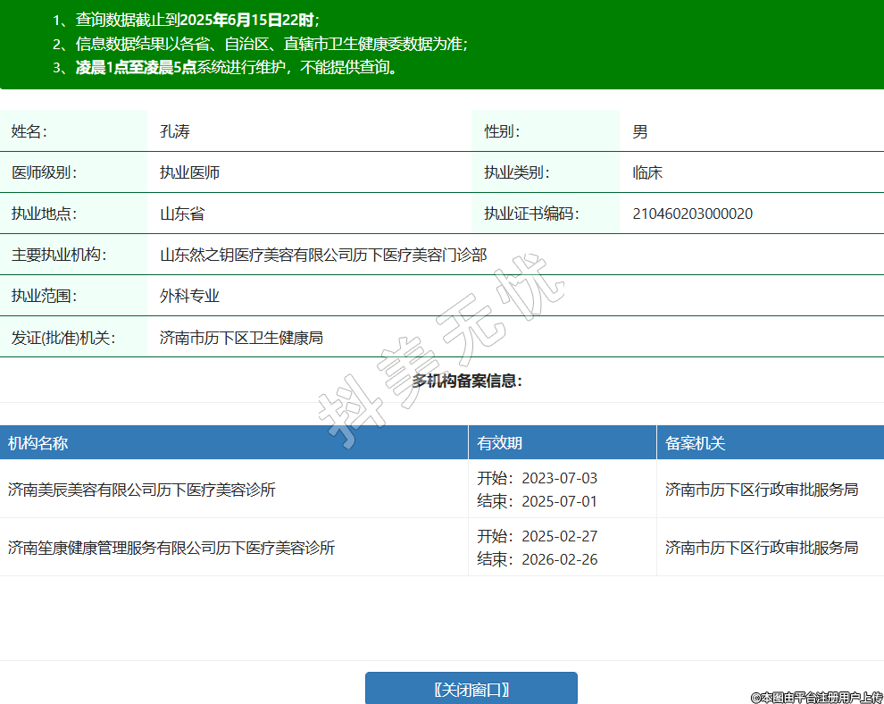 姓名:孔濤性別:男醫(yī)師級別:執(zhí)業(yè)醫(yī)師執(zhí)業(yè)類別:臨床執(zhí)業(yè)地點:山東省執(zhí)業(yè)證書編碼:210460203000020主要執(zhí)業(yè)機構(gòu):山東然之鑰醫(yī)療美容有限公司歷下醫(yī)療美容門診部執(zhí)業(yè)范圍:外科專業(yè)發(fā)證(批準)機關(guān):濟南市歷下區(qū)衛(wèi)生健康局多機構(gòu)備案信息:機構(gòu)名稱 有效期 備案機關(guān) 濟南美辰美容有限公司歷下醫(yī)療美容診所 開始:2023-07-03結(jié)束:2025-07-01濟南市歷下區(qū)行政審批服務局 濟南笙康健康管理服務有限公司歷下醫(yī)療美容診所 開始:2025-02-27結(jié)束:2026-02-26濟南市歷下區(qū)行政審批服務局 -
