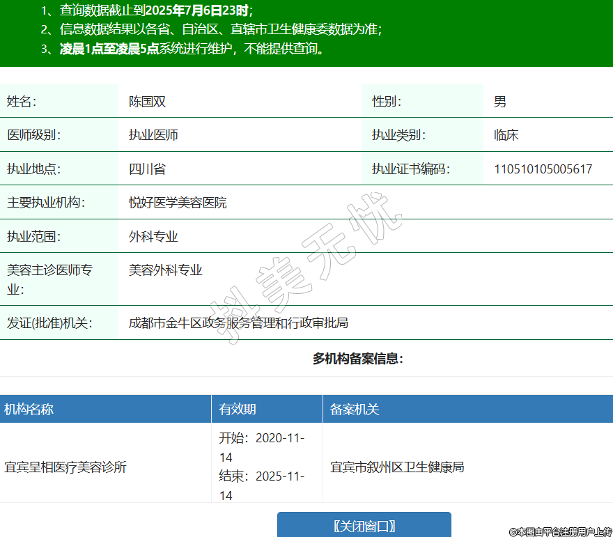 姓名:陳國(guó)雙性別:男醫(yī)師級(jí)別:執(zhí)業(yè)醫(yī)師執(zhí)業(yè)類別:臨床執(zhí)業(yè)地點(diǎn):四川省執(zhí)業(yè)證書編碼:110510105005617主要執(zhí)業(yè)機(jī)構(gòu):悅好醫(yī)學(xué)美容醫(yī)院執(zhí)業(yè)范圍:外科專業(yè)美容主診醫(yī)師專業(yè):美容外科專業(yè)發(fā)證(批準(zhǔn))機(jī)關(guān):成都市金牛區(qū)政務(wù)服務(wù)管理和行政審批局多機(jī)構(gòu)備案信息:機(jī)構(gòu)名稱 有效期 備案機(jī)關(guān) 宜賓呈相醫(yī)療美容診所 開始:2020-11-14結(jié)束:2025-11-14宜賓市敘州區(qū)衛(wèi)生健康局 成都青羊華人醫(yī)聯(lián)為美醫(yī)療美容門診部 開始:2023-07-08結(jié)束:2025-08-08成都市青羊區(qū)行政審批局(成都市青羊區(qū)政務(wù)服務(wù)管理和網(wǎng)絡(luò)理政辦公室) 成都高新維星顏醫(yī)療美容門診部 開始:2023-08-16結(jié)束:2025-08-15成都高新技術(shù)產(chǎn)業(yè)開發(fā)區(qū)衛(wèi)生健康局 成都錦欣婦產(chǎn)科醫(yī)院 開始:2023-09-09結(jié)束:2025-09-07成都市錦江區(qū)行政審批局 -