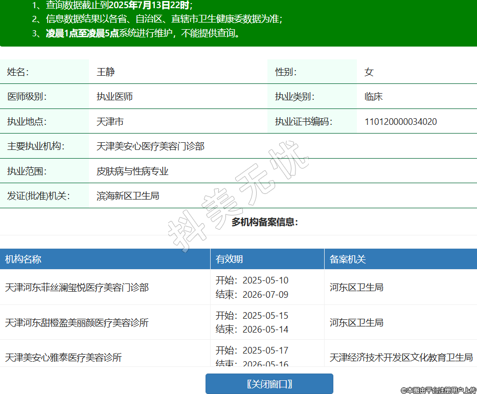 姓名:王靜性別:女醫(yī)師級別:執(zhí)業(yè)醫(yī)師執(zhí)業(yè)類別:臨床執(zhí)業(yè)地點(diǎn):天津市執(zhí)業(yè)證書編碼:110120000034020主要執(zhí)業(yè)機(jī)構(gòu):天津美安心醫(yī)療美容門診部執(zhí)業(yè)范圍:皮膚病與性病專業(yè)發(fā)證(批準(zhǔn))機(jī)關(guān):濱海新區(qū)衛(wèi)生局多機(jī)構(gòu)備案信息:機(jī)構(gòu)名稱 有效期 備案機(jī)關(guān) 天津河?xùn)|菲絲瀾璽悅醫(yī)療美容門診部 開始:2025-05-10結(jié)束:2026-07-09河?xùn)|區(qū)衛(wèi)生局 天津河?xùn)|甜橙盈美麗顏醫(yī)療美容診所 開始:2025-05-15結(jié)束:2026-05-14河?xùn)|區(qū)衛(wèi)生局 天津美安心雅泰醫(yī)療美容診所 開始:2025-05-17結(jié)束:2026-05-16天津經(jīng)濟(jì)技術(shù)開發(fā)區(qū)文化教育衛(wèi)生局 天津河?xùn)|伊頌璽悅醫(yī)療美容門診部 開始:2025-06-17結(jié)束:2026-06-16河?xùn)|區(qū)衛(wèi)生局 -