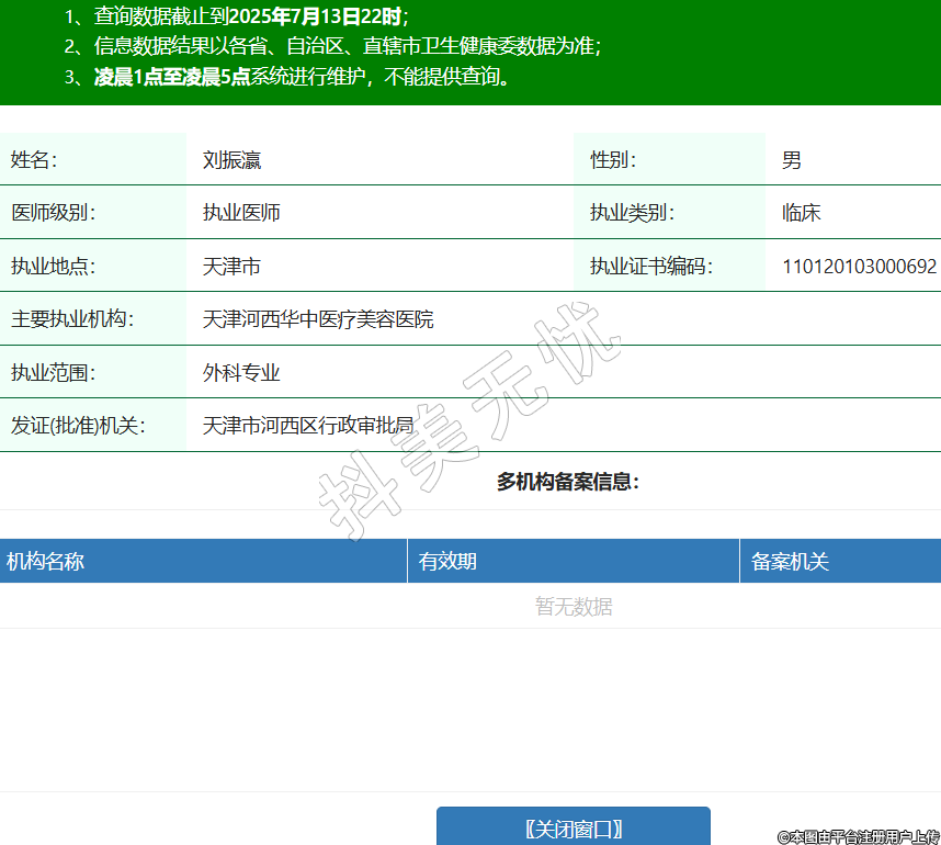 姓名:劉振瀛性別:男醫(yī)師級別:執(zhí)業(yè)醫(yī)師執(zhí)業(yè)類別:臨床執(zhí)業(yè)地點(diǎn):天津市執(zhí)業(yè)證書編碼:110120103000692主要執(zhí)業(yè)機(jī)構(gòu):天津河西華中醫(yī)療美容醫(yī)院執(zhí)業(yè)范圍:外科專業(yè)發(fā)證(批準(zhǔn))機(jī)關(guān):天津市河西區(qū)行政審批局 -