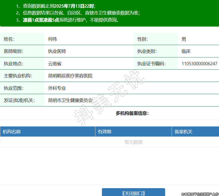 姓名:何偉性別:男醫(yī)師級(jí)別:執(zhí)業(yè)醫(yī)師執(zhí)業(yè)類(lèi)別:臨床執(zhí)業(yè)地點(diǎn):云南省執(zhí)業(yè)證書(shū)編碼:110530000006247主要執(zhí)業(yè)機(jī)構(gòu):昆明韓辰醫(yī)療美容醫(yī)院執(zhí)業(yè)范圍:外科專(zhuān)業(yè)發(fā)證(批準(zhǔn))機(jī)關(guān):昆明市衛(wèi)生健康委員會(huì) -