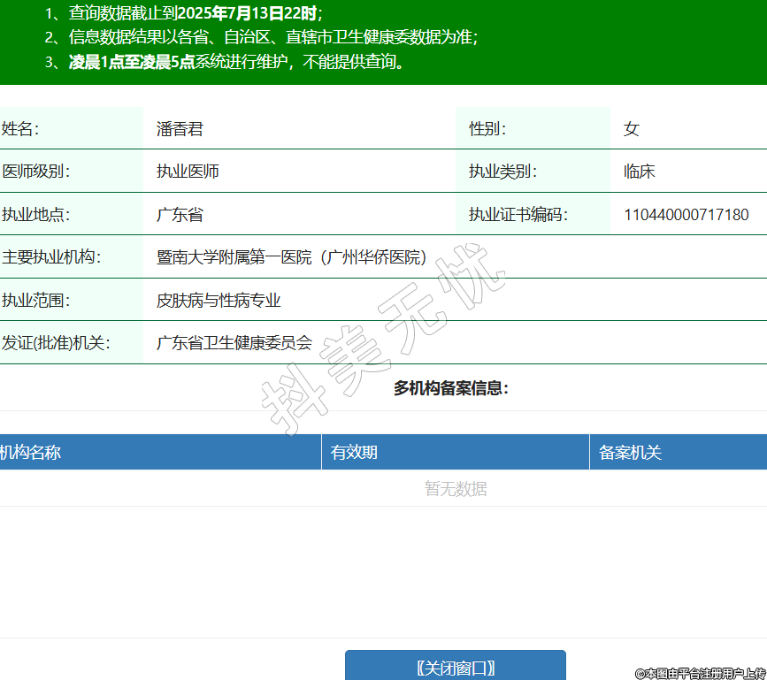 姓名:潘香君性別:女醫(yī)師級別:執(zhí)業(yè)醫(yī)師執(zhí)業(yè)類別:臨床執(zhí)業(yè)地點:廣東省執(zhí)業(yè)證書編碼:110440000717180主要執(zhí)業(yè)機構(gòu):暨南大學附屬第一醫(yī)院(廣州華僑醫(yī)院)執(zhí)業(yè)范圍:皮膚病與性病專業(yè)發(fā)證(批準)機關:廣東省衛(wèi)生健康委員會 -
