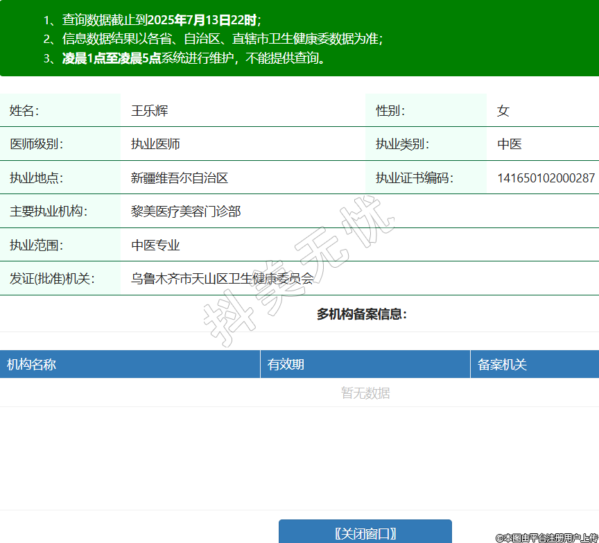 姓名:王樂輝性別:女醫(yī)師級別:執(zhí)業(yè)醫(yī)師執(zhí)業(yè)類別:中醫(yī)執(zhí)業(yè)地點:新疆維吾爾自治區(qū)執(zhí)業(yè)證書編碼:141650102000287主要執(zhí)業(yè)機(jī)構(gòu):黎美醫(yī)療美容門診部執(zhí)業(yè)范圍:中醫(yī)專業(yè)發(fā)證(批準(zhǔn))機(jī)關(guān):烏魯木齊市天山區(qū)衛(wèi)生健康委員會 -