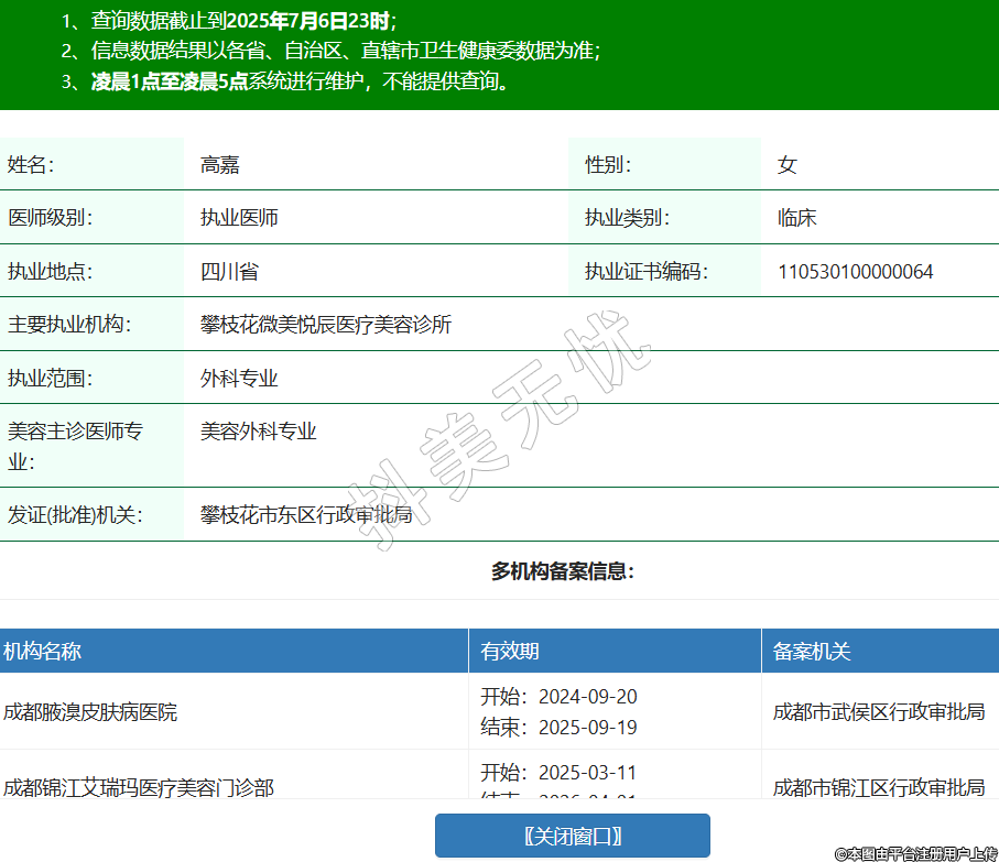 姓名:高嘉性別:女醫(yī)師級別:執(zhí)業(yè)醫(yī)師執(zhí)業(yè)類別:臨床執(zhí)業(yè)地點:四川省執(zhí)業(yè)證書編碼:110530100000064主要執(zhí)業(yè)機構(gòu):攀枝花微美悅辰醫(yī)療美容診所執(zhí)業(yè)范圍:外科專業(yè)美容主診醫(yī)師專業(yè):美容外科專業(yè)發(fā)證(批準)機關(guān):攀枝花市東區(qū)行政審批局多機構(gòu)備案信息:機構(gòu)名稱 有效期 備案機關(guān) 成都腋溴皮膚病醫(yī)院 開始:2024-09-20結(jié)束:2025-09-19成都市武侯區(qū)行政審批局 成都錦江艾瑞瑪醫(yī)療美容門診部 開始:2025-03-11結(jié)束:2026-04-01成都市錦江區(qū)行政審批局 成都成華圣華悅妍醫(yī)療美容診所 開始:2025-06-10結(jié)束:2026-06-09成都市成華區(qū)行政審批局 -
