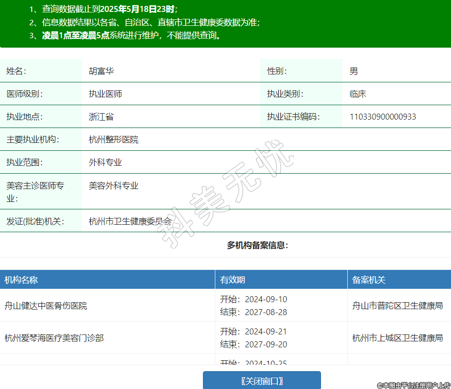 姓名:胡富華性別:男醫(yī)師級(jí)別:執(zhí)業(yè)醫(yī)師執(zhí)業(yè)類別:臨床執(zhí)業(yè)地點(diǎn):浙江省執(zhí)業(yè)證書編碼:110330900000933主要執(zhí)業(yè)機(jī)構(gòu):杭州整形醫(yī)院執(zhí)業(yè)范圍:外科專業(yè)美容主診醫(yī)師專業(yè):美容外科專業(yè)發(fā)證(批準(zhǔn))機(jī)關(guān):杭州市衛(wèi)生健康委員會(huì)多機(jī)構(gòu)備案信息:機(jī)構(gòu)名稱 有效期 備案機(jī)關(guān) 舟山健達(dá)中醫(yī)骨傷醫(yī)院 開始:2024-09-10結(jié)束:2027-08-28舟山市普陀區(qū)衛(wèi)生健康局 杭州愛琴海醫(yī)療美容門診部 開始:2024-09-21結(jié)束:2027-09-20杭州市上城區(qū)衛(wèi)生健康局 杭州蕭山蘭澤歐醫(yī)療美容門診部 開始:2024-10-25結(jié)束:2026-10-23杭州市蕭山區(qū)衛(wèi)生健康局 舟山定海廣華醫(yī)院 開始:2025-02-27結(jié)束:2028-12-31舟山市衛(wèi)生健康委員會(huì) -