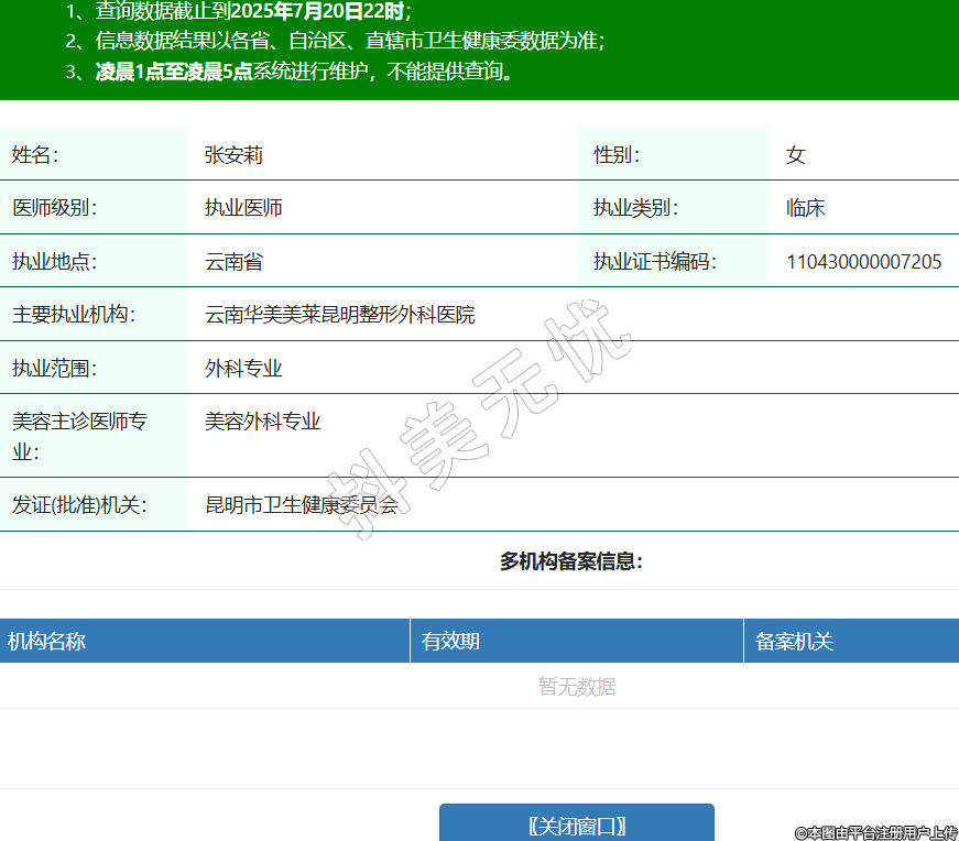 姓名:張安莉性別:女醫(yī)師級(jí)別:執(zhí)業(yè)醫(yī)師執(zhí)業(yè)類(lèi)別:臨床執(zhí)業(yè)地點(diǎn):云南省執(zhí)業(yè)證書(shū)編碼:110430000007205主要執(zhí)業(yè)機(jī)構(gòu):云南華美美萊昆明整形外科醫(yī)院執(zhí)業(yè)范圍:外科專(zhuān)業(yè)美容主診醫(yī)師專(zhuān)業(yè):美容外科專(zhuān)業(yè)發(fā)證(批準(zhǔn))機(jī)關(guān):昆明市衛(wèi)生健康委員會(huì) -