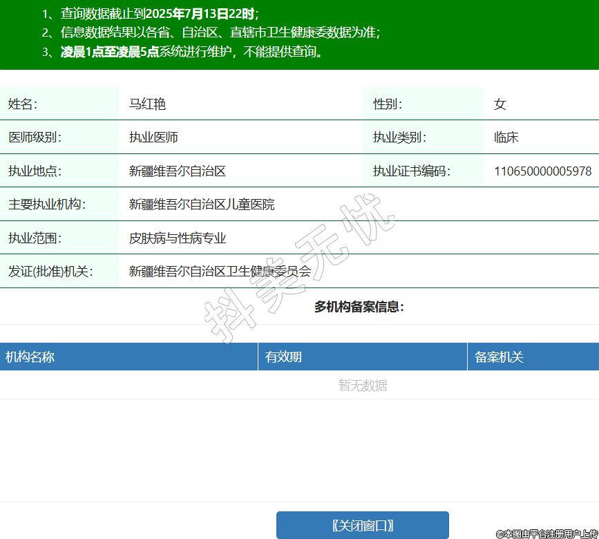 姓名:馬紅艷性別:女醫(yī)師級別:執(zhí)業(yè)醫(yī)師執(zhí)業(yè)類別:臨床執(zhí)業(yè)地點:新疆維吾爾自治區(qū)執(zhí)業(yè)證書編碼:110650000005978主要執(zhí)業(yè)機構(gòu):新疆維吾爾自治區(qū)兒童醫(yī)院執(zhí)業(yè)范圍:皮膚病與性病專業(yè)發(fā)證(批準)機關(guān):新疆維吾爾自治區(qū)衛(wèi)生健康委員會 -