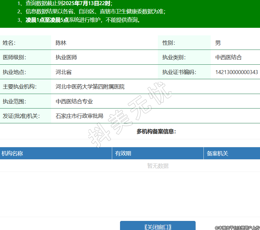 姓名:陳林性別:男醫(yī)師級(jí)別:執(zhí)業(yè)醫(yī)師執(zhí)業(yè)類(lèi)別:中西醫(yī)結(jié)合執(zhí)業(yè)地點(diǎn):河北省執(zhí)業(yè)證書(shū)編碼:142130000000343主要執(zhí)業(yè)機(jī)構(gòu):河北中醫(yī)藥大學(xué)第四附屬醫(yī)院執(zhí)業(yè)范圍:中西醫(yī)結(jié)合專(zhuān)業(yè)發(fā)證(批準(zhǔn))機(jī)關(guān):石家莊市行政審批局 -