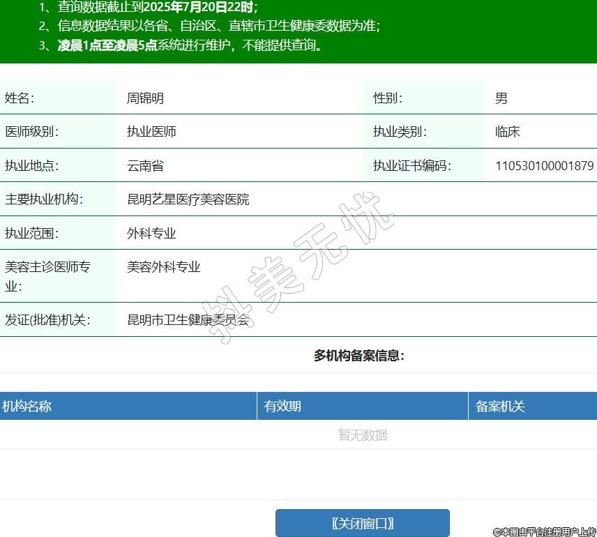 姓名:周錦明性別:男醫(yī)師級別:執(zhí)業(yè)醫(yī)師執(zhí)業(yè)類別:臨床執(zhí)業(yè)地點:云南省執(zhí)業(yè)證書編碼:110530100001879主要執(zhí)業(yè)機構:昆明藝星醫(yī)療美容醫(yī)院執(zhí)業(yè)范圍:外科專業(yè)美容主診醫(yī)師專業(yè):美容外科專業(yè)發(fā)證(批準)機關:昆明市衛(wèi)生健康委員會 -