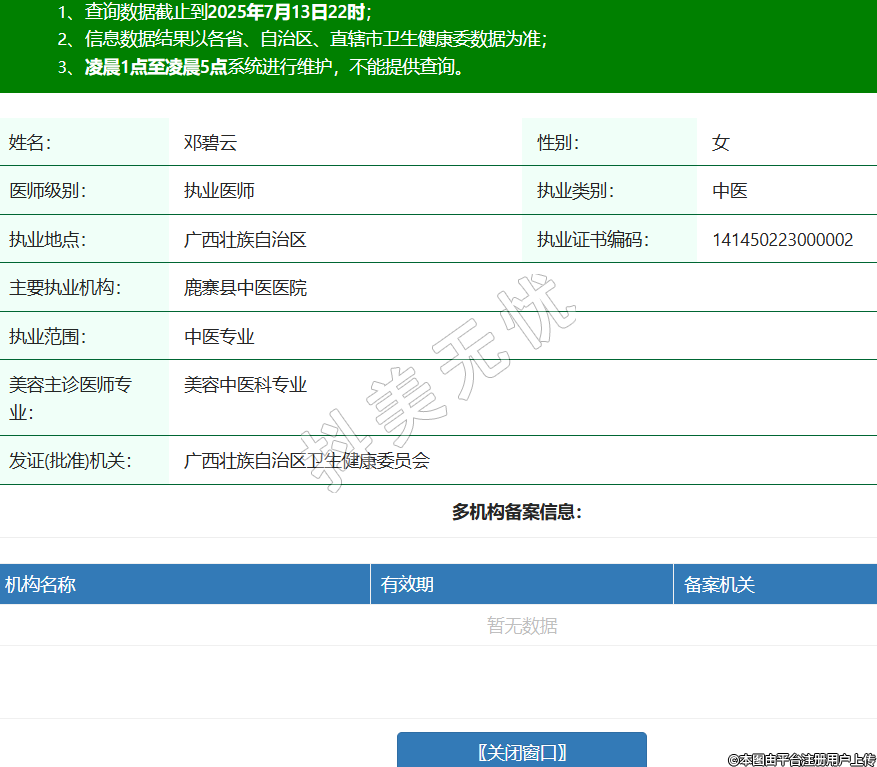 姓名:鄧碧云性別:女醫(yī)師級(jí)別:執(zhí)業(yè)醫(yī)師執(zhí)業(yè)類別:中醫(yī)執(zhí)業(yè)地點(diǎn):廣西壯族自治區(qū)執(zhí)業(yè)證書編碼:141450223000002主要執(zhí)業(yè)機(jī)構(gòu):鹿寨縣中醫(yī)醫(yī)院執(zhí)業(yè)范圍:中醫(yī)專業(yè)美容主診醫(yī)師專業(yè):美容中醫(yī)科專業(yè)發(fā)證(批準(zhǔn))機(jī)關(guān):廣西壯族自治區(qū)衛(wèi)生健康委員會(huì) -