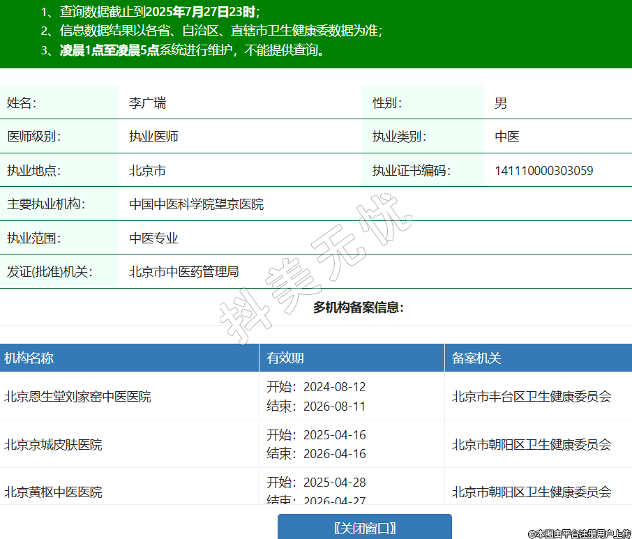 姓名:李廣瑞性別:男醫(yī)師級別:執(zhí)業(yè)醫(yī)師執(zhí)業(yè)類別:中醫(yī)執(zhí)業(yè)地點:北京市執(zhí)業(yè)證書編碼:141110000303059主要執(zhí)業(yè)機(jī)構(gòu):中國中醫(yī)科學(xué)院望京醫(yī)院執(zhí)業(yè)范圍:中醫(yī)專業(yè)發(fā)證(批準(zhǔn))機(jī)關(guān):北京市中醫(yī)藥管理局多機(jī)構(gòu)備案信息:機(jī)構(gòu)名稱 有效期 備案機(jī)關(guān) 北京恩生堂劉家窯中醫(yī)醫(yī)院 開始:2024-08-12結(jié)束:2026-08-11北京市豐臺區(qū)衛(wèi)生健康委員會 北京京城皮膚醫(yī)院 開始:2025-04-16結(jié)束:2026-04-16北京市朝陽區(qū)衛(wèi)生健康委員會 北京黃樞中醫(yī)醫(yī)院 開始:2025-04-28結(jié)束:2026-04-27北京市朝陽區(qū)衛(wèi)生健康委員會 -