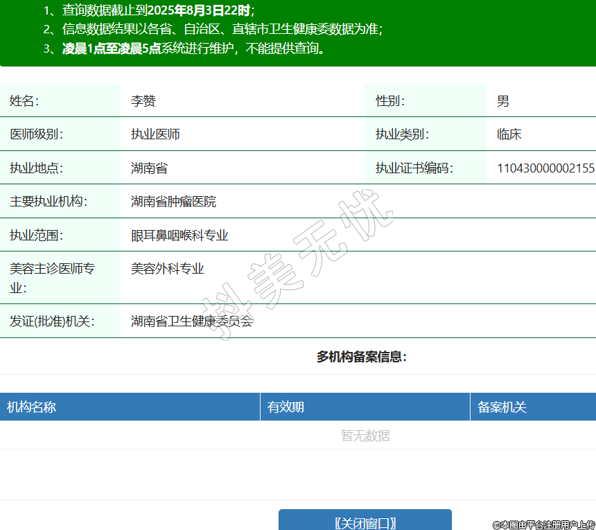 姓名:李贊性別:男醫(yī)師級別:執(zhí)業(yè)醫(yī)師執(zhí)業(yè)類別:臨床執(zhí)業(yè)地點:湖南省執(zhí)業(yè)證書編碼:110430000002155主要執(zhí)業(yè)機構(gòu):湖南省腫瘤醫(yī)院執(zhí)業(yè)范圍:眼耳鼻咽喉科專業(yè)美容主診醫(yī)師專業(yè):美容外科專業(yè)發(fā)證(批準)機關(guān):湖南省衛(wèi)生健康委員會 -