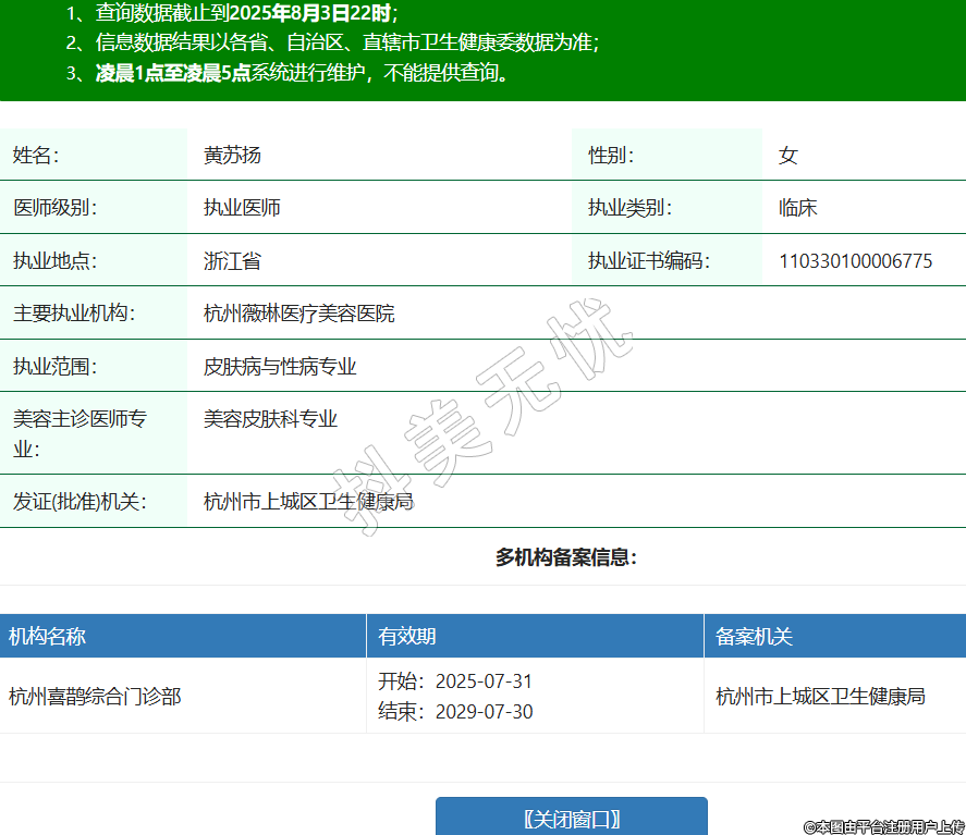 姓名:黃蘇揚性別:女醫(yī)師級別:執(zhí)業(yè)醫(yī)師執(zhí)業(yè)類別:臨床執(zhí)業(yè)地點:浙江省執(zhí)業(yè)證書編碼:110330100006775主要執(zhí)業(yè)機構(gòu):杭州薇琳醫(yī)療美容醫(yī)院執(zhí)業(yè)范圍:皮膚病與性病專業(yè)美容主診醫(yī)師專業(yè):美容皮膚科專業(yè)發(fā)證(批準)機關(guān):杭州市上城區(qū)衛(wèi)生健康局多機構(gòu)備案信息:機構(gòu)名稱 有效期 備案機關(guān) 杭州喜鵲綜合門診部 開始:2025-07-31結(jié)束:2029-07-30杭州市上城區(qū)衛(wèi)生健康局 -