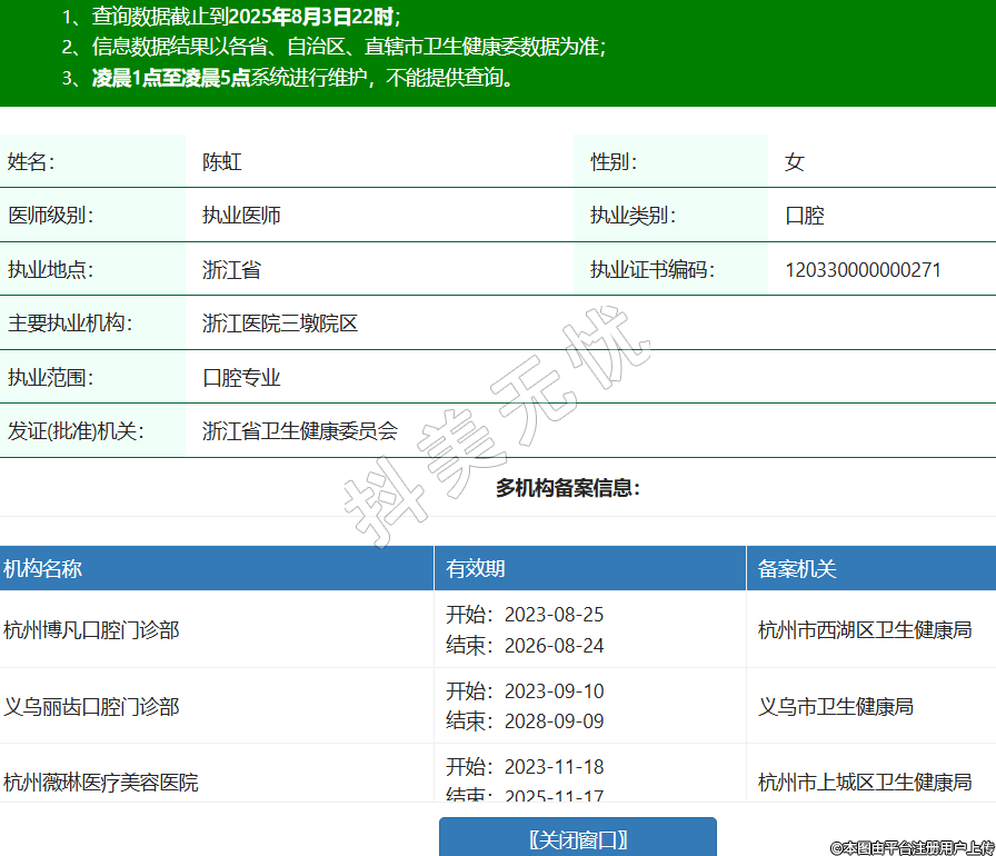 姓名:陳虹性別:女醫(yī)師級(jí)別:執(zhí)業(yè)醫(yī)師執(zhí)業(yè)類別:口腔執(zhí)業(yè)地點(diǎn):浙江省執(zhí)業(yè)證書(shū)編碼:120330000000271主要執(zhí)業(yè)機(jī)構(gòu):浙江醫(yī)院三墩院區(qū)執(zhí)業(yè)范圍:口腔專業(yè)發(fā)證(批準(zhǔn))機(jī)關(guān):浙江省衛(wèi)生健康委員會(huì)多機(jī)構(gòu)備案信息:機(jī)構(gòu)名稱 有效期 備案機(jī)關(guān) 杭州博凡口腔門(mén)診部 開(kāi)始:2023-08-25結(jié)束:2026-08-24杭州市西湖區(qū)衛(wèi)生健康局 義烏麗齒口腔門(mén)診部 開(kāi)始:2023-09-10結(jié)束:2028-09-09義烏市衛(wèi)生健康局 杭州薇琳醫(yī)療美容醫(yī)院 開(kāi)始:2023-11-18結(jié)束:2025-11-17杭州市上城區(qū)衛(wèi)生健康局 浦江筱鳴口腔診所 開(kāi)始:2023-12-01結(jié)束:2028-11-30浦江縣衛(wèi)生健康局 天臺(tái)徐娜口腔診所 開(kāi)始:2024-11-01結(jié)束:2027-10-31天臺(tái)縣行政審批局 衢州市柯城金衢口腔門(mén)診部 開(kāi)始:2025-04-25結(jié)束:2028-04-24衢州市柯城區(qū)衛(wèi)生健康局 -