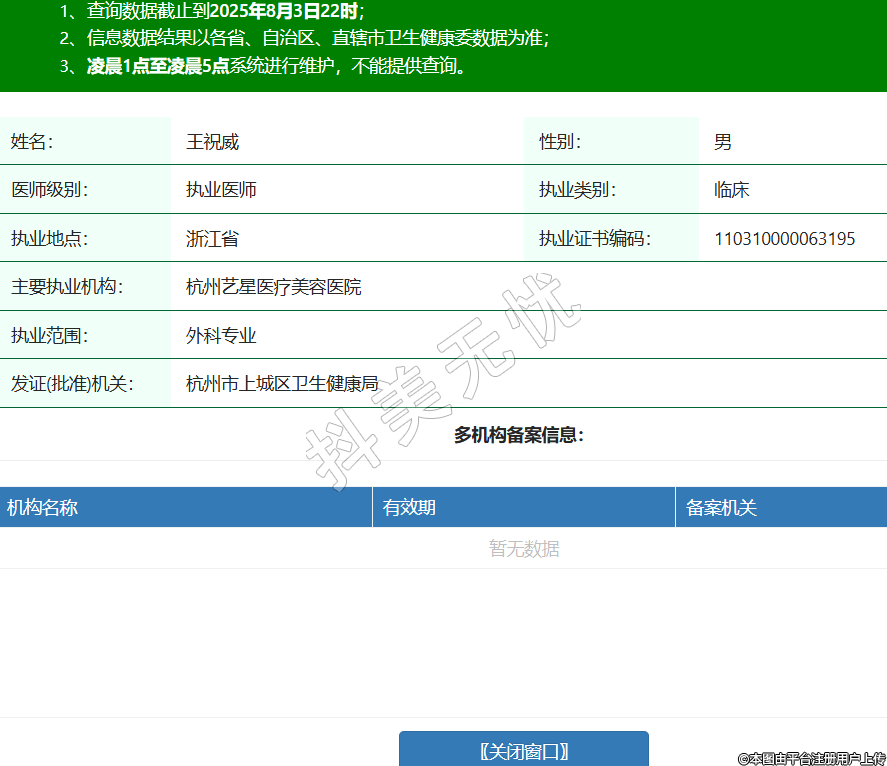 姓名:王祝威性別:男醫(yī)師級(jí)別:執(zhí)業(yè)醫(yī)師執(zhí)業(yè)類(lèi)別:臨床執(zhí)業(yè)地點(diǎn):浙江省執(zhí)業(yè)證書(shū)編碼:110310000063195主要執(zhí)業(yè)機(jī)構(gòu):杭州藝星醫(yī)療美容醫(yī)院執(zhí)業(yè)范圍:外科專(zhuān)業(yè)發(fā)證(批準(zhǔn))機(jī)關(guān):杭州市上城區(qū)衛(wèi)生健康局 -