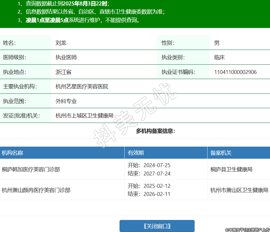 姓名:劉龍性別:男醫(yī)師級(jí)別:執(zhí)業(yè)醫(yī)師執(zhí)業(yè)類別:臨床執(zhí)業(yè)地點(diǎn):浙江省執(zhí)業(yè)證書編碼:110411000002906主要執(zhí)業(yè)機(jī)構(gòu):杭州藝星醫(yī)療美容醫(yī)院執(zhí)業(yè)范圍:外科專業(yè)發(fā)證(批準(zhǔn))機(jī)關(guān):杭州市上城區(qū)衛(wèi)生健康局多機(jī)構(gòu)備案信息:機(jī)構(gòu)名稱 有效期 備案機(jī)關(guān) 桐廬韓加醫(yī)療美容門診部 開始:2024-07-25結(jié)束:2027-07-24桐廬縣衛(wèi)生健康局 杭州蕭山顏冉醫(yī)療美容門診部 開始:2025-02-12結(jié)束:2026-02-11杭州市蕭山區(qū)衛(wèi)生健康局 -