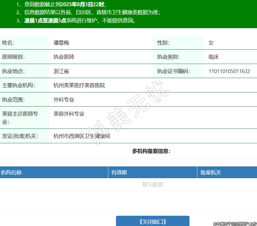 姓名:譚章梅性別:女醫(yī)師級別:執(zhí)業(yè)醫(yī)師執(zhí)業(yè)類別:臨床執(zhí)業(yè)地點(diǎn):浙江省執(zhí)業(yè)證書編碼:110110105011632主要執(zhí)業(yè)機(jī)構(gòu):杭州美萊醫(yī)療美容醫(yī)院執(zhí)業(yè)范圍:外科專業(yè)美容主診醫(yī)師專業(yè):美容外科專業(yè)發(fā)證(批準(zhǔn))機(jī)關(guān):杭州市西湖區(qū)衛(wèi)生健康局 -