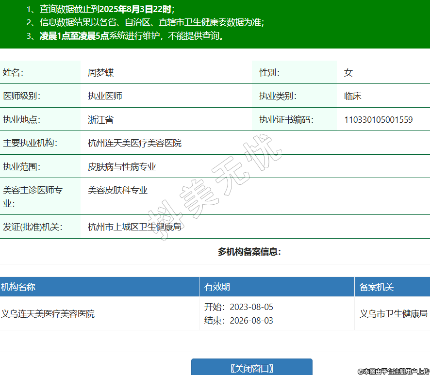 姓名:周夢(mèng)蝶性別:女醫(yī)師級(jí)別:執(zhí)業(yè)醫(yī)師執(zhí)業(yè)類(lèi)別:臨床執(zhí)業(yè)地點(diǎn):浙江省執(zhí)業(yè)證書(shū)編碼:110330105001559主要執(zhí)業(yè)機(jī)構(gòu):杭州連天美醫(yī)療美容醫(yī)院執(zhí)業(yè)范圍:皮膚病與性病專(zhuān)業(yè)美容主診醫(yī)師專(zhuān)業(yè):美容皮膚科專(zhuān)業(yè)發(fā)證(批準(zhǔn))機(jī)關(guān):杭州市上城區(qū)衛(wèi)生健康局多機(jī)構(gòu)備案信息:機(jī)構(gòu)名稱(chēng) 有效期 備案機(jī)關(guān) 義烏連天美醫(yī)療美容醫(yī)院 開(kāi)始:2023-08-05結(jié)束:2026-08-03義烏市衛(wèi)生健康局 -