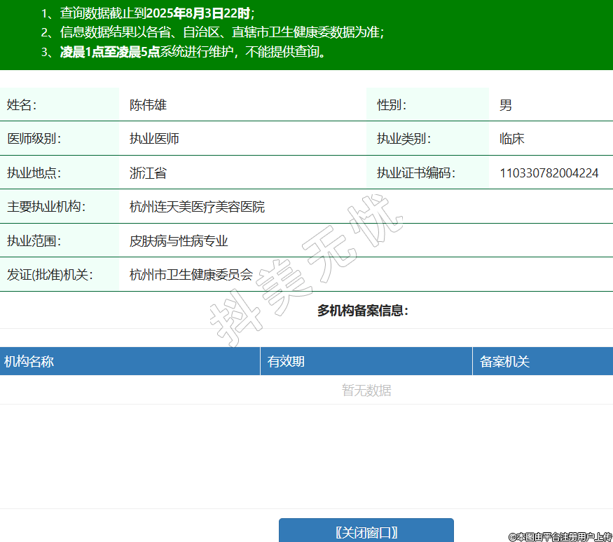 姓名:陳偉雄性別:男醫(yī)師級別:執(zhí)業(yè)醫(yī)師執(zhí)業(yè)類別:臨床執(zhí)業(yè)地點(diǎn):浙江省執(zhí)業(yè)證書編碼:110330782004224主要執(zhí)業(yè)機(jī)構(gòu):杭州連天美醫(yī)療美容醫(yī)院執(zhí)業(yè)范圍:皮膚病與性病專業(yè)發(fā)證(批準(zhǔn))機(jī)關(guān):杭州市衛(wèi)生健康委員會 -