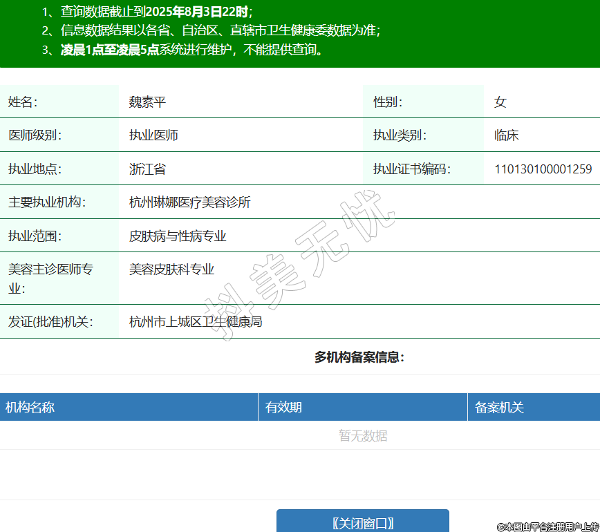 姓名:魏素平性別:女醫(yī)師級(jí)別:執(zhí)業(yè)醫(yī)師執(zhí)業(yè)類別:臨床執(zhí)業(yè)地點(diǎn):浙江省執(zhí)業(yè)證書編碼:110130100001259主要執(zhí)業(yè)機(jī)構(gòu):杭州琳娜醫(yī)療美容診所執(zhí)業(yè)范圍:皮膚病與性病專業(yè)美容主診醫(yī)師專業(yè):美容皮膚科專業(yè)發(fā)證(批準(zhǔn))機(jī)關(guān):杭州市上城區(qū)衛(wèi)生健康局 -