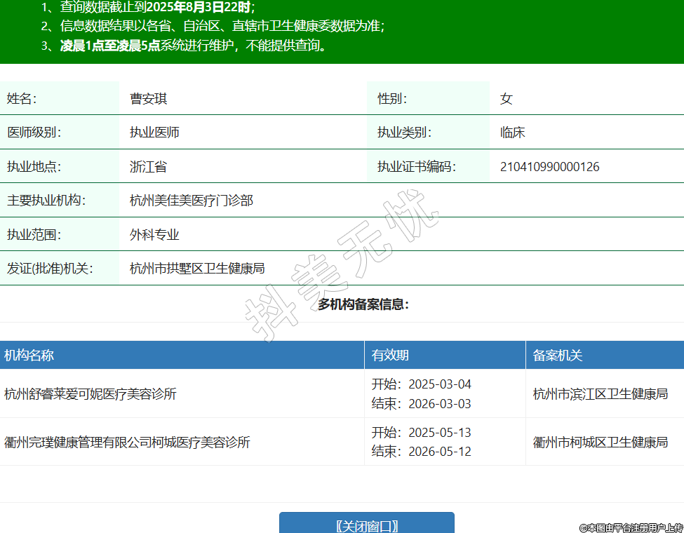 姓名:曹安琪性別:女醫(yī)師級別:執(zhí)業(yè)醫(yī)師執(zhí)業(yè)類別:臨床執(zhí)業(yè)地點:浙江省執(zhí)業(yè)證書編碼:210410990000126主要執(zhí)業(yè)機構:杭州美佳美醫(yī)療門診部執(zhí)業(yè)范圍:外科專業(yè)發(fā)證(批準)機關:杭州市拱墅區(qū)衛(wèi)生健康局多機構備案信息:機構名稱 有效期 備案機關 杭州舒睿萊愛可妮醫(yī)療美容診所 開始:2025-03-04結束:2026-03-03杭州市濱江區(qū)衛(wèi)生健康局 衢州完璞健康管理有限公司柯城醫(yī)療美容診所 開始:2025-05-13結束:2026-05-12衢州市柯城區(qū)衛(wèi)生健康局 -