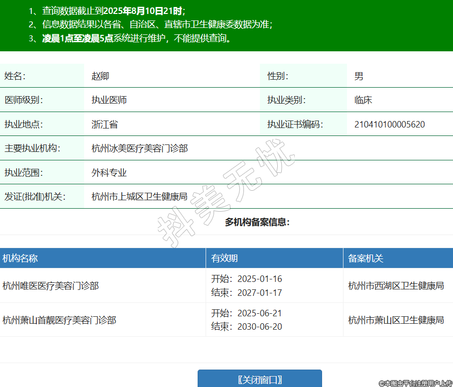 姓名:趙卿性別:男醫(yī)師級(jí)別:執(zhí)業(yè)醫(yī)師執(zhí)業(yè)類別:臨床執(zhí)業(yè)地點(diǎn):浙江省執(zhí)業(yè)證書編碼:210410100005620主要執(zhí)業(yè)機(jī)構(gòu):杭州冰美醫(yī)療美容門診部執(zhí)業(yè)范圍:外科專業(yè)發(fā)證(批準(zhǔn))機(jī)關(guān):杭州市上城區(qū)衛(wèi)生健康局多機(jī)構(gòu)備案信息:機(jī)構(gòu)名稱 有效期 備案機(jī)關(guān) 杭州唯醫(yī)醫(yī)療美容門診部 開始:2025-01-16結(jié)束:2027-01-17杭州市西湖區(qū)衛(wèi)生健康局 杭州蕭山首靚醫(yī)療美容門診部 開始:2025-06-21結(jié)束:2030-06-20杭州市蕭山區(qū)衛(wèi)生健康局 -